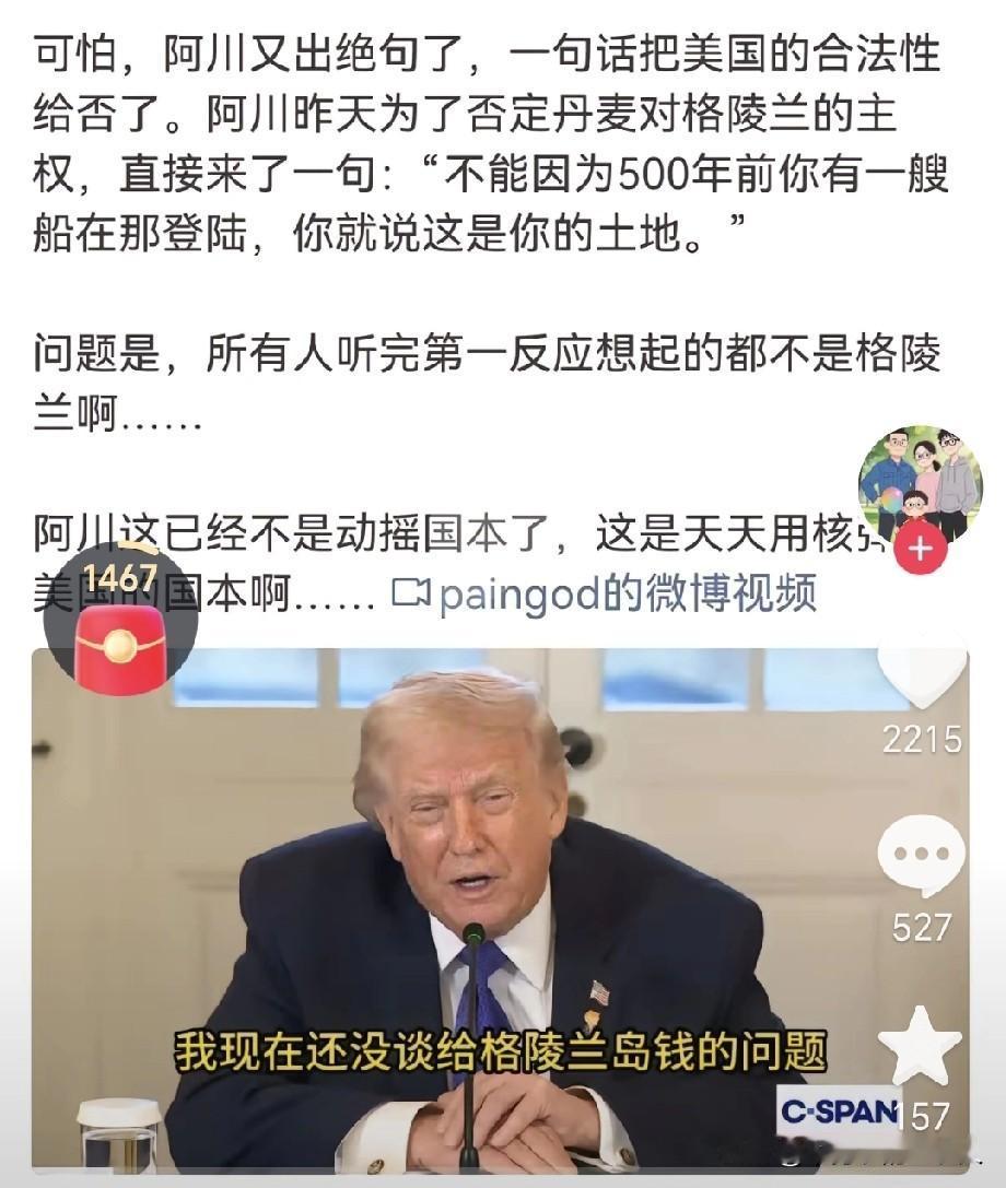 “不能因为500年前你有一艘船在那登陆,你就说这是你的土地。” 近期,特朗普为否定丹麦对格陵兰岛的主权,又出“金句”。 问题是,美国这块土地也是几百年前哥伦布通过几条船登陆霸占的。特朗普的“登陆悖论”:500年前的船,到底算不算主权凭证? 这番话直指领土归属的核心逻辑,却忘了回头看看美国自身的发家史——恰恰是一场由“几条船登陆”开启的殖民往事。 1492年,哥伦布率领三艘帆船横渡大西洋,在美洲巴哈马群岛登陆,将这片早已栖息着原住民的土地纳入欧洲视野 。尽管他始终误以为抵达了印度,却为后续数个世纪的欧洲殖民浪潮埋下伏笔。西班牙、英国等殖民者接踵而至,通过武力征服、资源掠夺与文化压制,逐步瓦解了美洲原住民的家园。 而如今的美国,正是在这片被“登陆”的土地上建立起来的。从1513年西班牙探险队抵达佛罗里达,到1620年“五月花”号带来清教徒,美国的领土扩张史,本质上就是一部以“登陆”为起点的殖民史。 更具讽刺意味的是,特朗普口中“不算数”的登陆行为,恰恰是美国主权合法性的最初来源。 当特朗普质疑丹麦对格陵兰岛的主权时,似乎选择性遗忘了:美国如今的广袤领土,何尝不是“500年前几条船登陆”后逐步霸占的结果? 500年前的船,既能成为美国领土扩张的起点,却不能成为丹麦拥有格陵兰岛的凭证?这样的逻辑悖论,说到底不过是霸权思维的暴露。