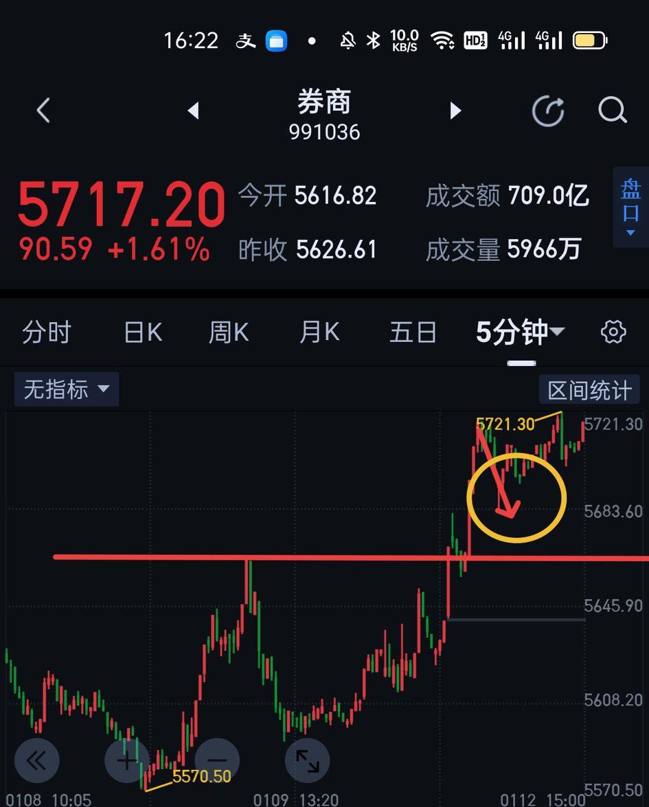 券商板块,继上周五结束了三十分钟的一笔下后,今天继续延着三十分钟的支撑线向上运行。五分钟图上在上午完成对5662突破后,随之的回踩动作确认了突破的有效性。明天5680只要能站稳,当下的三十分钟一笔上将继续向上生长,耐心跟随即可。
