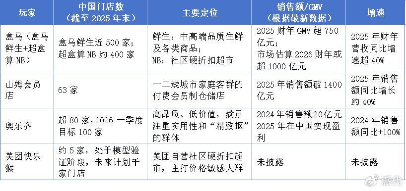 当然,从行业视角看,盒马并非没有对手。山姆、奥乐齐、美团快乐猴等玩家,都在各自的细分赛道中快速推进。派代梳理了近几年在中国市场表现较为突出的几家零售业态,从它们的定位与进展中,可以更清楚地看出盒马的相对优势: