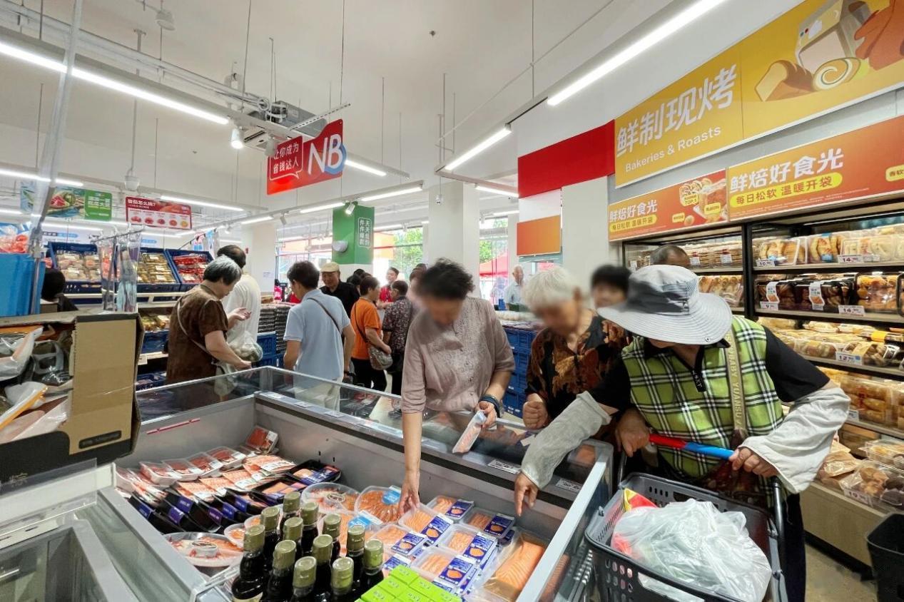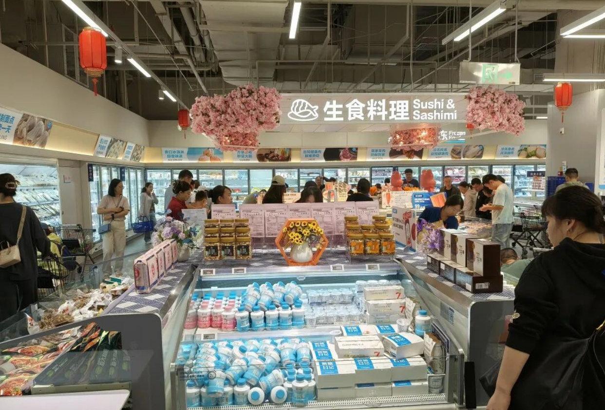 其中盒马鲜生聚焦中高端市场,围绕“品质生鲜+即时零售”做深度经营。走进盒马鲜生门店就能明显感觉到,生鲜依然是绝对主角,有机蔬果、品质肉类、鲜活水产琳琅满目,不少门店还设有现制餐饮区与堂食座位。其单店面积控制在2500-5000平方米,选址覆盖社区市场和核心商圈,而且已经从过去的一二线城市逐步下沉到低线城市。据《时代在线》报道,盒马鲜生SKU约4800个,线上订单占比超60%,即时零售已经成为其主要增量来源。