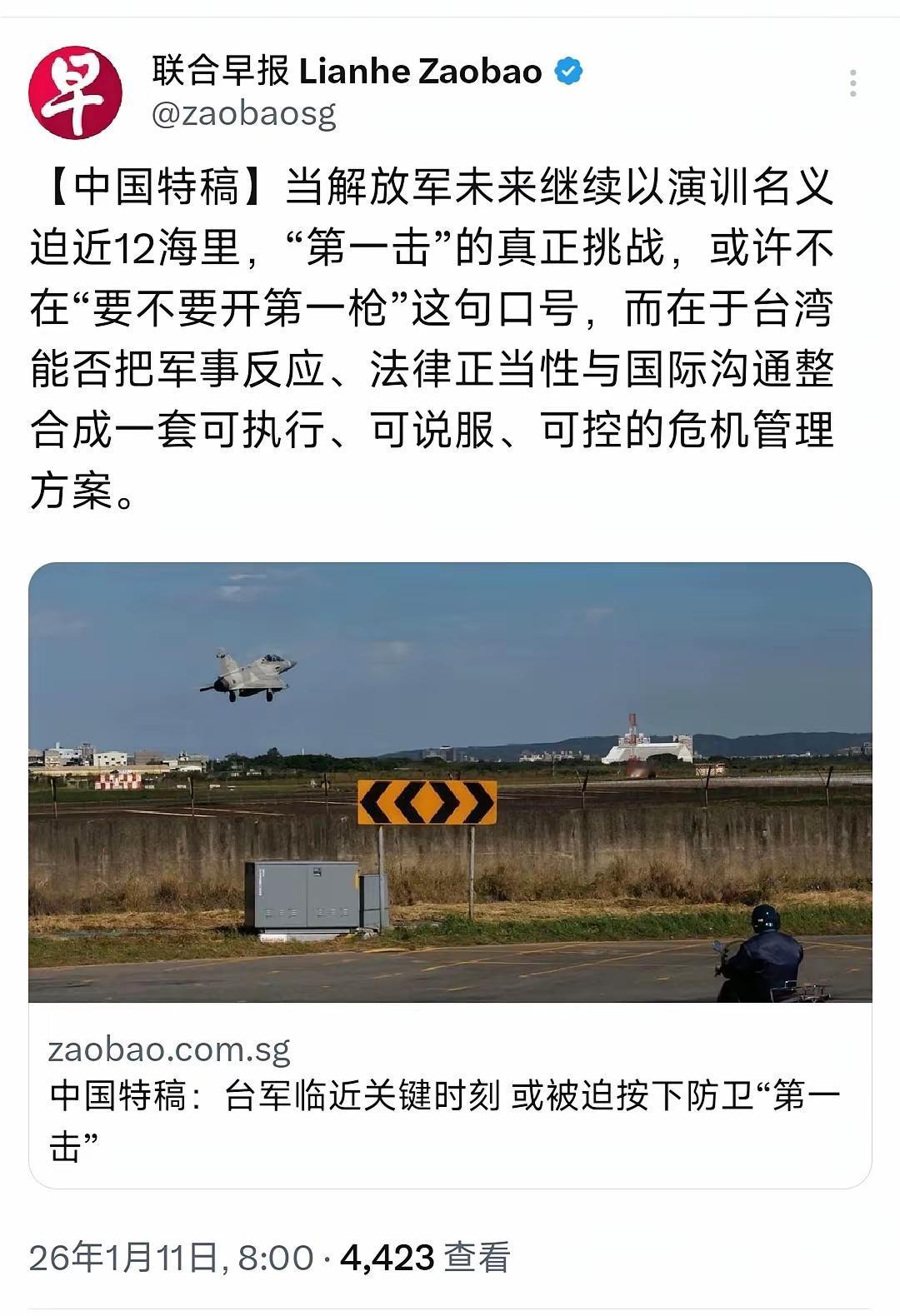 新加坡联合早报:为应对解放军军演,台湾要把军事反应、法律正当性与国际沟通整合成一套可执行、可说服、可控的危机管理方案。 喷两句:新加坡联合早报给台独出的这个主意太坏了,坏到骨子里了。新加坡联合早报对上次解放军军演突破台“当局”所划的所谓12海里底线的应对非常失望。它认为台“当局”没有制定应对解放军突破12海里的应对措施,只会喊口号。因此他建议台当局不仅要从军事上做出应对措施,还要通过立法从法律层面应对,更要想办法把外部力量拉进来,形成一套完整的应对解放军军演的可操作措施。新加坡已经站在了中国的对立面。