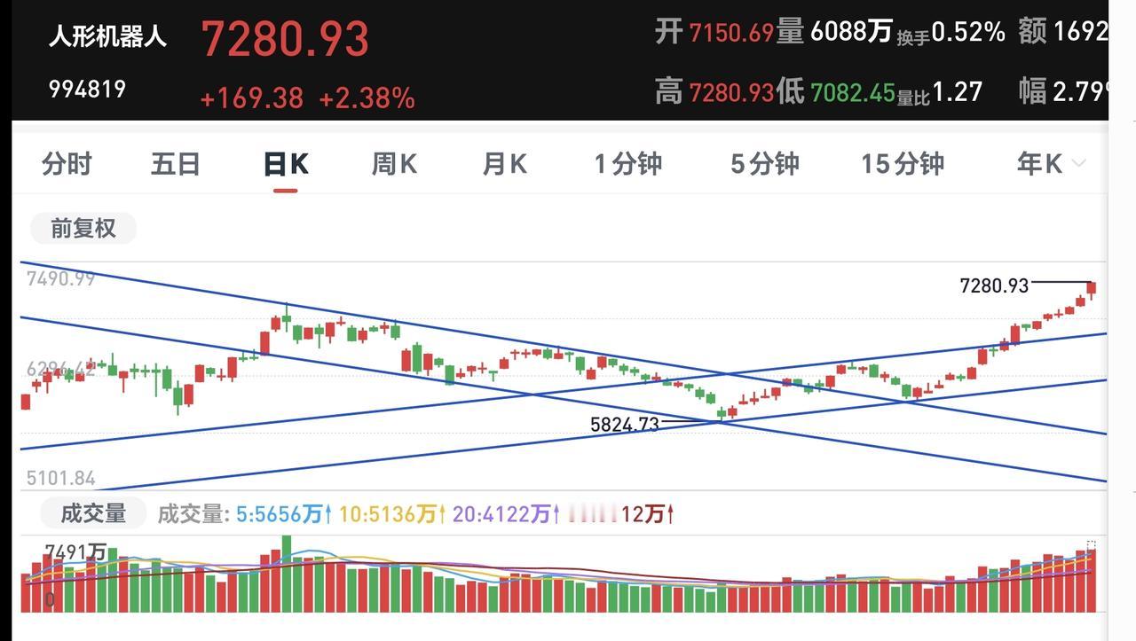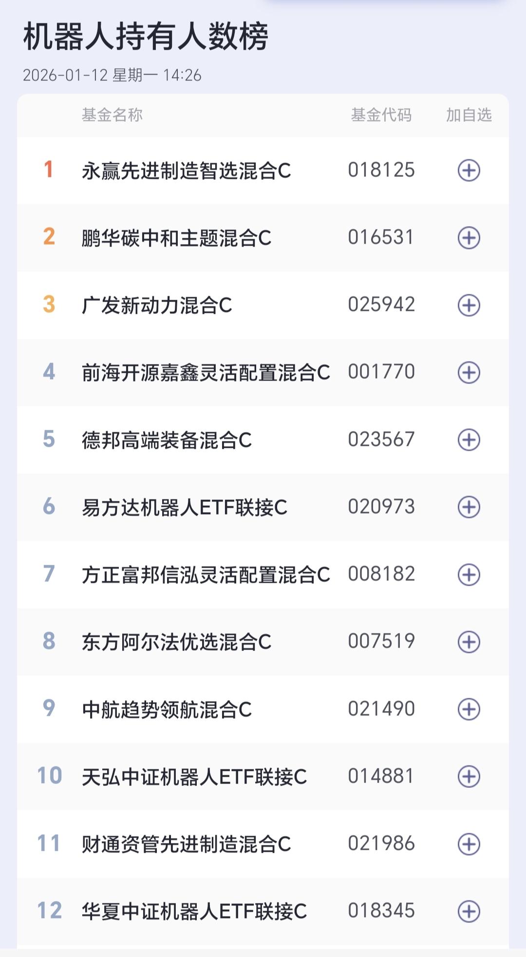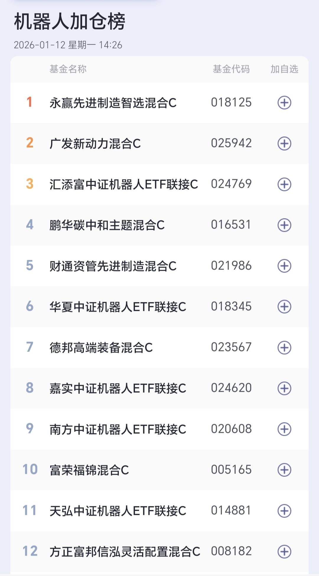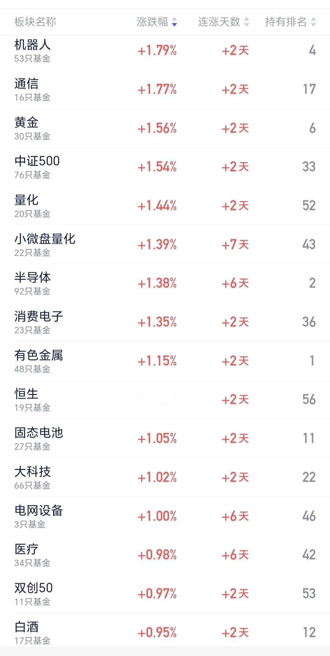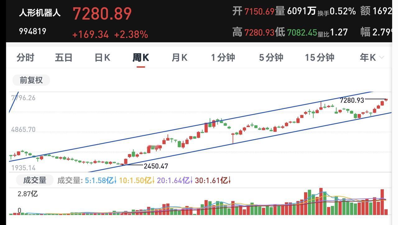 基金:机器人板块应该怎么办 机器人板块今天也是上涨,是连续第2个交易日上涨,今天盘中估值上涨了1.81%,持有人数在所有板块中排名第4位。 这个板块今天加仓人数排行榜见下面的截图3,持有人数排行榜见下面的截图4,排名第一的都是永赢先进制造智选混合。 我们来看一下下面的截图5,这是机器人板块日K线图,从图中可以看出,我画了两条倾斜向上的斜线,这是机器人板块日线级别短期上涨通道。上个星期上涨突破了这个上涨通道的上轨,然后是一直持续上涨到现在。 我们来看一下下面的截图6,这是机器人板块周K线图,从图中可以看出,我画了两条倾斜向上的斜线,这是机器人板块周线级别上涨通道,现在的位置处于这个上涨通道内,也就是说,机器人板块周线级别处于上涨趋势中,机器人板块大方向向上。 机器人板块日线级别和周线级别都处于上涨趋势中,对于这样的板块应该要继续持有,直到上涨趋势被改变,才可以考虑要不要止盈出来观望。 我每天都会分享我的观点,我的观点只代表我个人的看法,不能作为你操作的依据,据此操作后果自负。