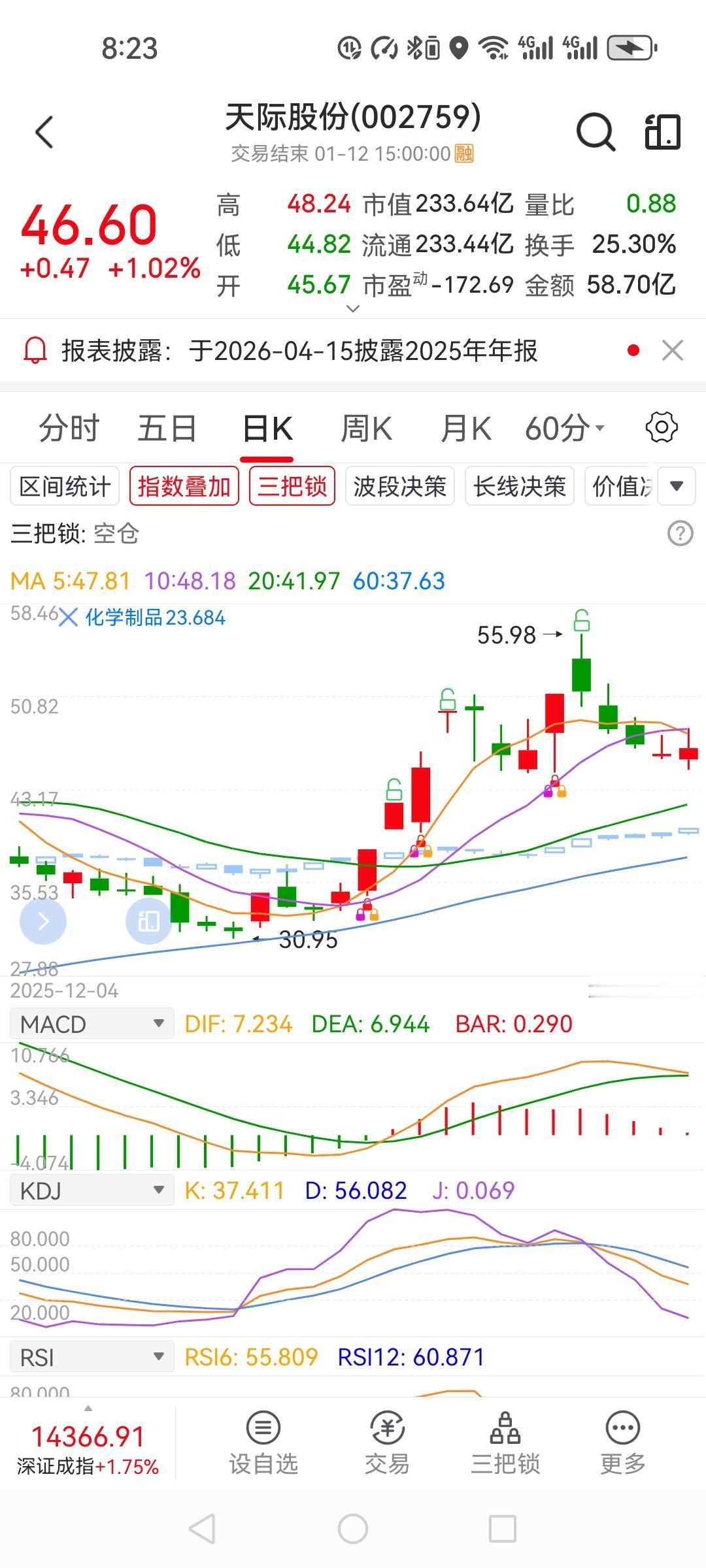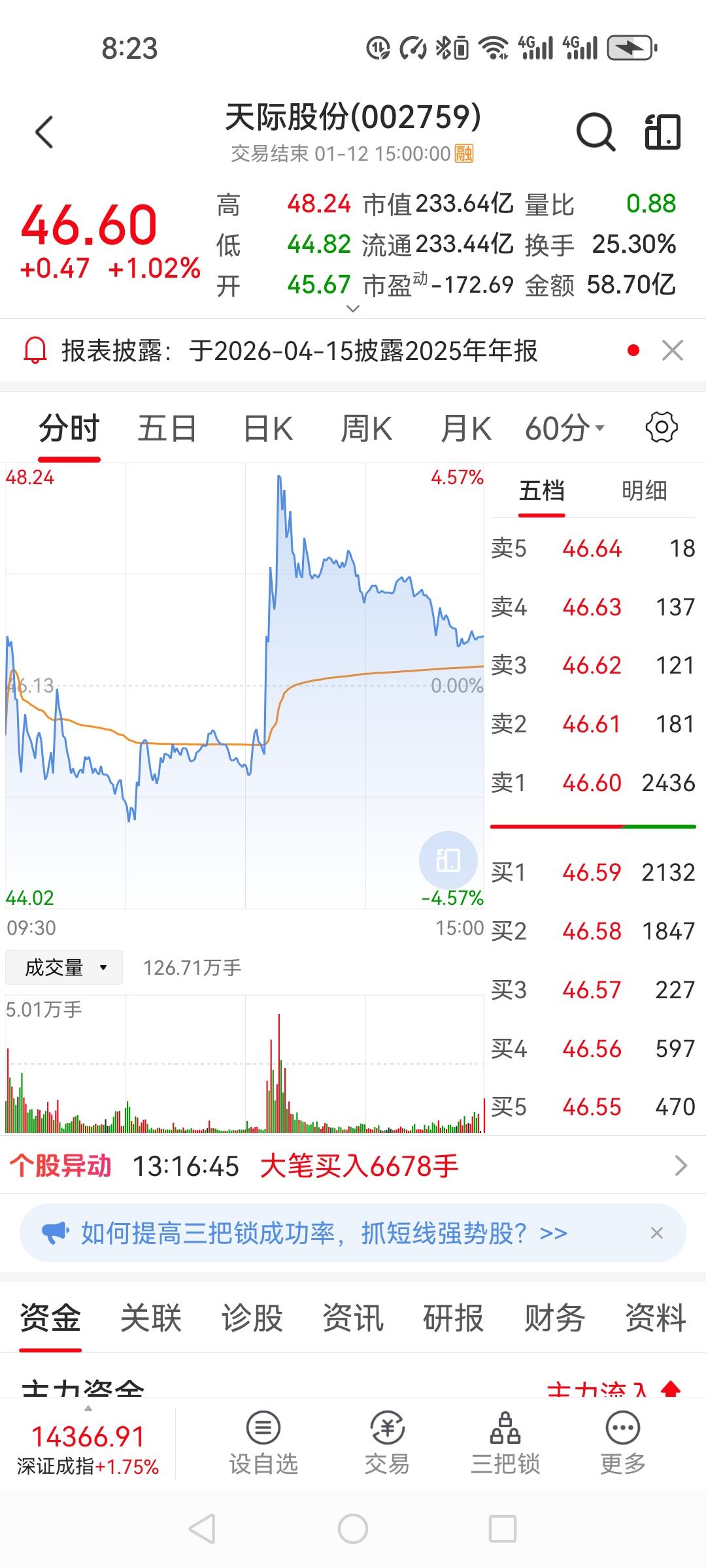 今天潜伏天际股份,买点没有卡准。早盘47.15冲进去,盘中一度冲到48.24,以
