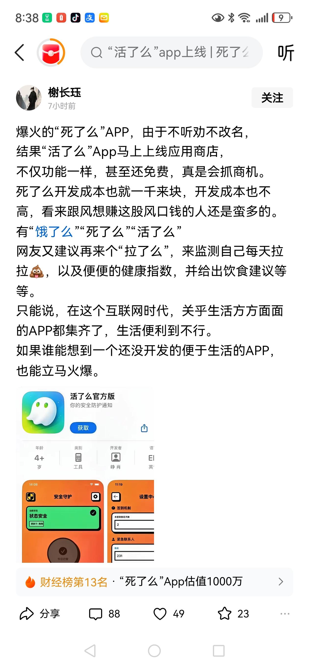 “死了么”刚火,就有人copy出一个“活了么”?功能一模一样,收费却为0。 “死了么”的1000万估值,马上灰飞烟没,随风而去了! 中国的产权保护,真的应该加强!人家抛家舍业,辛辛苦苦,刚刚有点小火苗,却被别人抄袭的大风,吹得凉凉了! 在这样的环境,谁还敢创新?