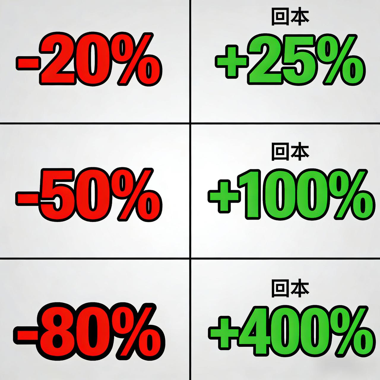 这是一个很容易被被忽视的数学陷阱: 亏损20%,需要上涨25%才能回本 亏损50%,需要上涨100%才能回本 亏损80%,需要上涨400%才能回本 很多投资者单纯的认为,下跌多少,对应的上涨多少,就可以回本,可实际情况是,需要翻倍才能回本,这也是很多投资者,为什么一直在回本的路上,把这张图片收藏保存下来,仔细研究清楚,方能不会被套。