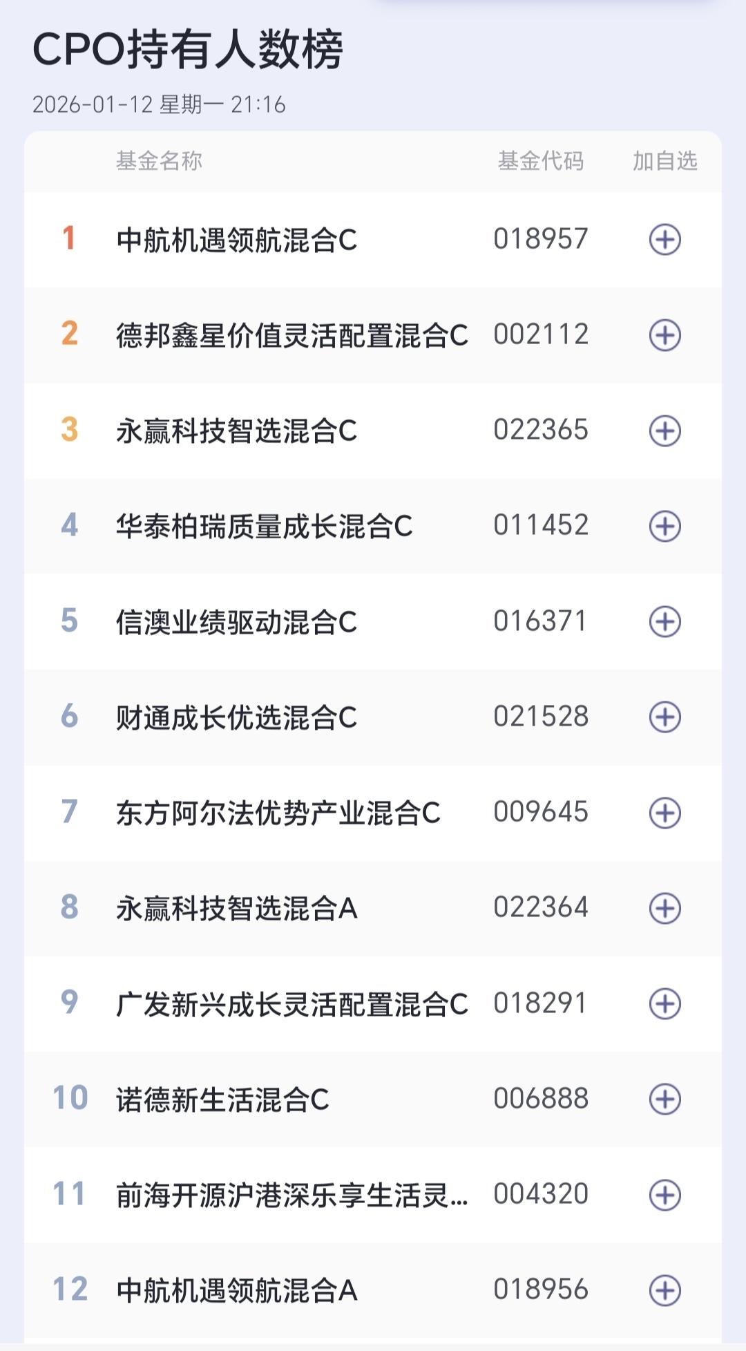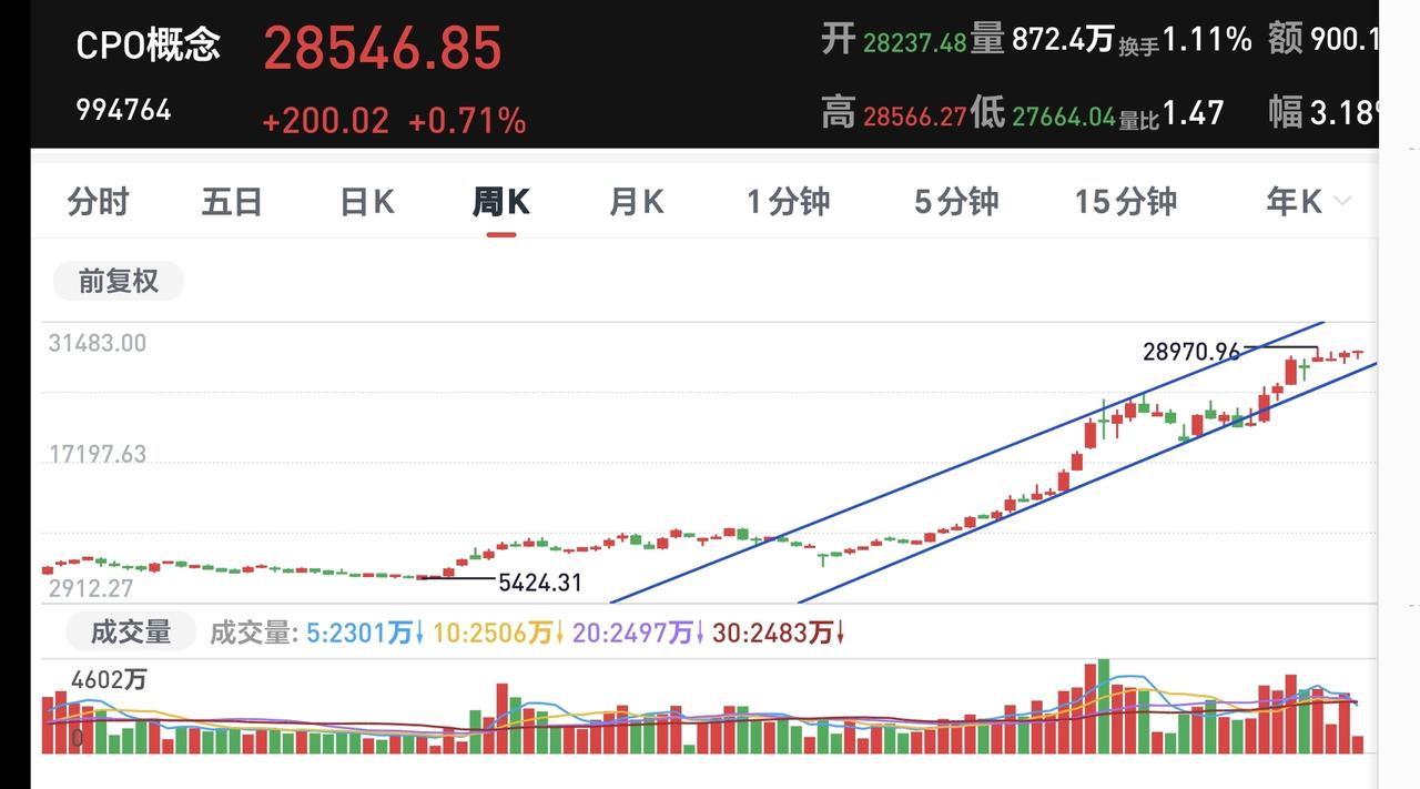 基金:Cpo板块应该怎么办 今天板块下跌幅度排行榜前三位的是:储能板块,cpo板块,化工板块,下跌幅度排名第2的是CPO板块,下跌了0.58%,下跌幅度不是很大,持有人数在所有板块中排名第三。 这个板块今天加仓人数排行榜见下面的截图3,持有人数排行榜见下面的截图4,排名第一的都是中航机遇领航混合。 我们来看一下下面的截图5,这是cpo板块日K线图,从图中可以看出,我画了两条倾斜向上的斜线,这是cpo板块日线级别上涨通道,现在的位置处于这个上涨通道中,也就是说,cpo板块日线级别处于上涨趋势中,短线持有的人可以继续持有,除非跌破这个上涨通道的下轨,才可以考虑要不要止盈出来观望。 我们来看一下下面的截图6,这是cpo板块周K线图,从图中可以看出,我画了两条倾斜向上的斜线,这是cpo板块周线级别上涨通道,现在的位置也是处于这个上涨通道内,说明这个板块周线级别也是处于上涨趋势中,这个板块的大方向是向上的,长线持有的人也是可以继续持有,除非跌破这个上涨通道的下轨,才可以考虑要不要止盈出来观望。 Cpo板块日线级别和周线级别都是上涨趋势中,长线和短线持有的人都可以继续持有,除非这两个上涨通道的下轨被跌破,才可以考虑要不要止盈出来观望。 我每天都会分享我的观点,我的观点只代表我个人的看法,不能作为你操作的依据,据此操作后果自负。