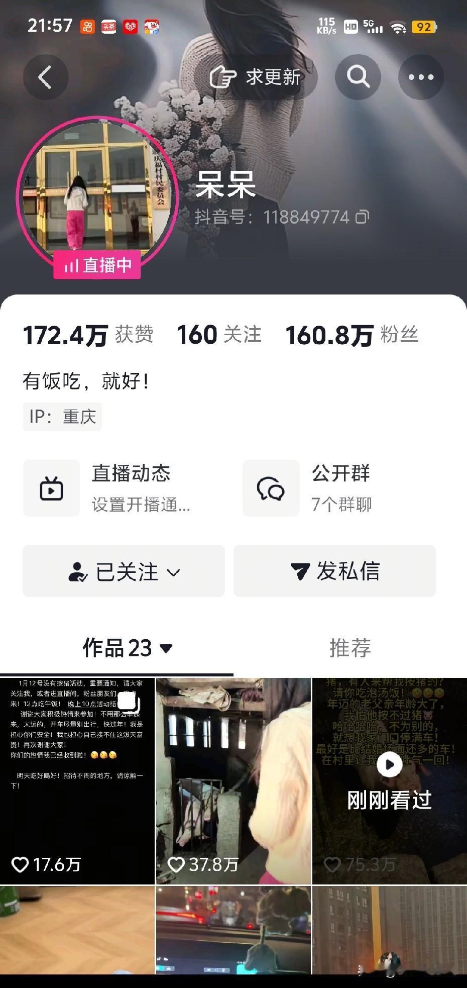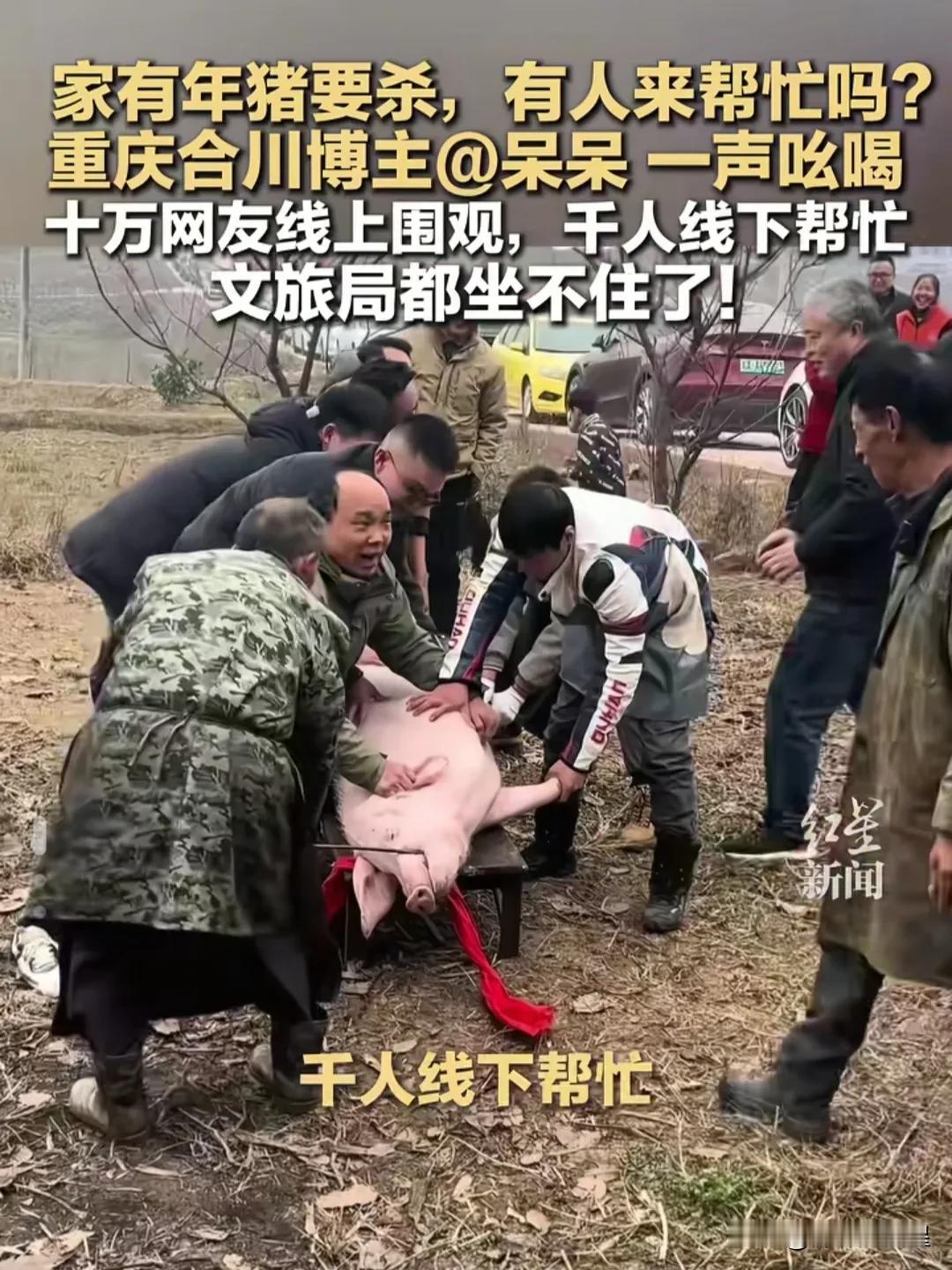 今晚10点,重庆合川呆呆妹发起的喝刨猪汤活动圆满结束。 1月9日,重庆合川女孩呆呆(网名)在网上求助称,1月11日,她家要杀2头年猪,因父亲年龄大了,担心11日家里杀猪时按不住,希望能有人帮忙按猪,并请大家喝刨猪汤,不为别的,就为门前能停满车,也能在村里扬眉吐气一回。 没想到帖子发出去后竞引来各地网友近2000人前来,当天加上网友送的一头和文旅送的两头猪,当天共杀了5头猪,因当天没吃完,第二天又延长了一天,这一次,呆呆的抖音账粉丝以几百涨到160万之多,直播间从中午12点开始,在线观众一直是10w+,直播间嘉年华等礼物刷个不停的满天飞。有人估算,呆朵仅直播间收到网友刷的礼物超百万,即使平台抽一半,她这2天就赚50万,虽然2头年猪被网友吃光了,但是,2天就赚了别人一辈子赚不到的钱,今晚上她高兴的能睡得着吗? 对此,大家怎么看?