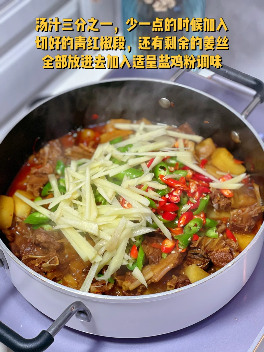 10. 汤汁三分之一,少一点的时候加入切好的青红椒段,还有剩余的姜丝全部放进去加入适量盐鸡粉调味