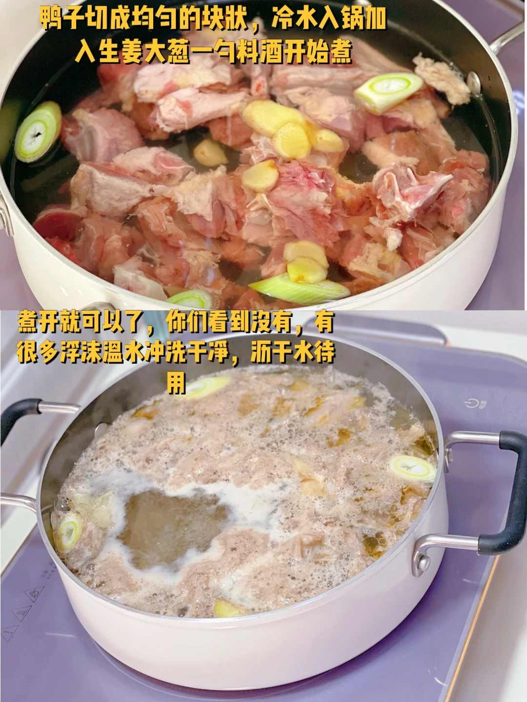 1 鸭子切成均匀的块状,冷水入锅加入生姜大葱一勺料酒开始煮