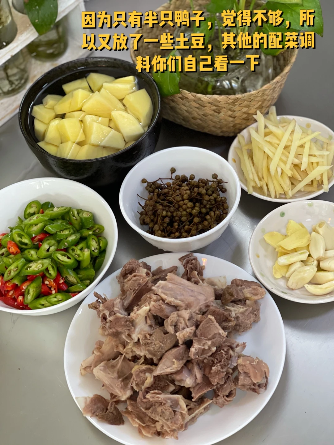还是朋友乡下回来的时候带给我的半只土鸭,然后我觉得有点少,所以放了些土豆没有想到这个搭配居然特别好吃,下次你们再做的时候也可以放一点萝卜或者是土豆都可以的家常菜的做法不用太拘束,根据自己的喜好来