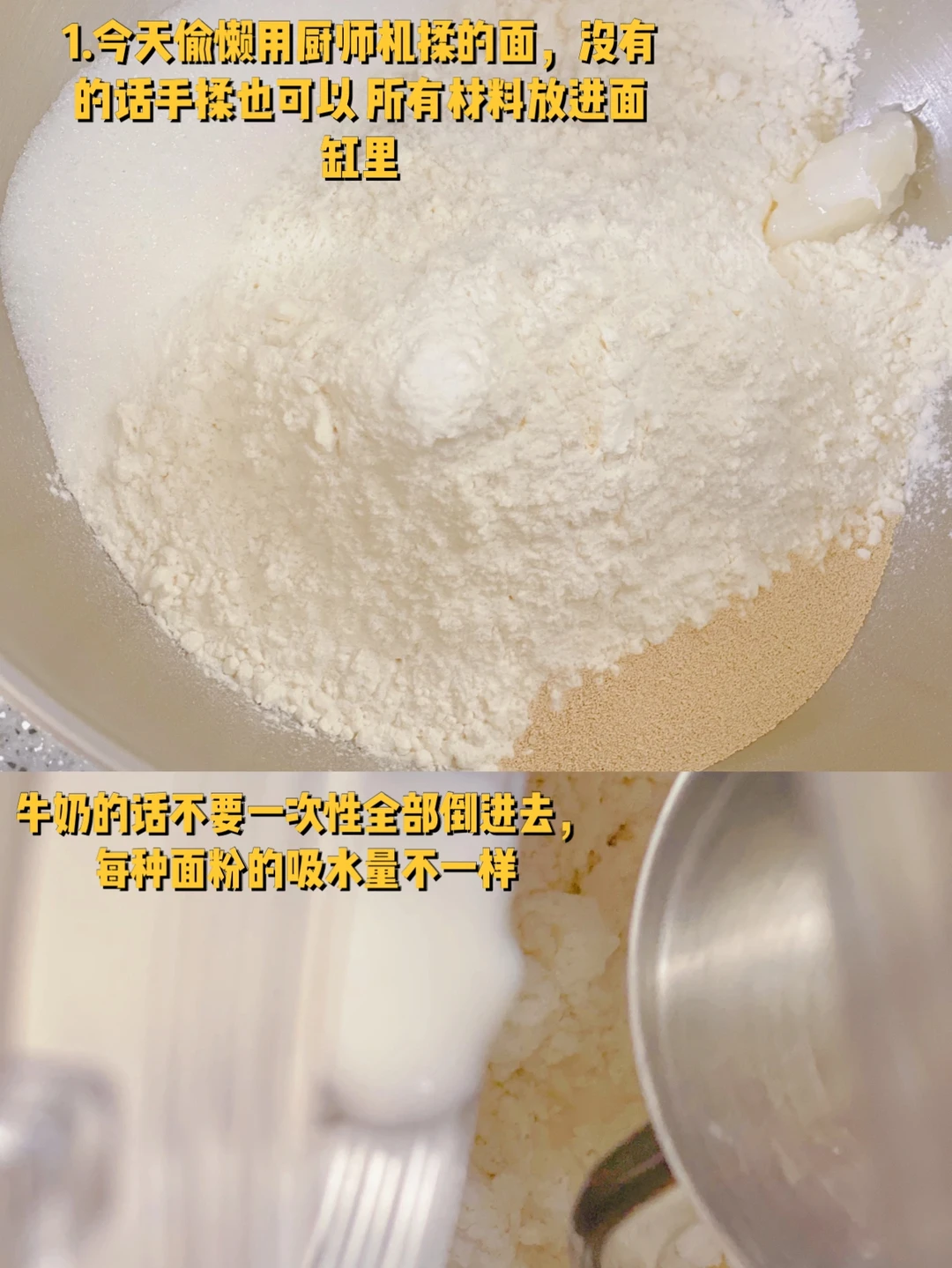 1.今天偷懒用厨师机揉的面,没有的话手揉也可以 所有材料放进面缸里