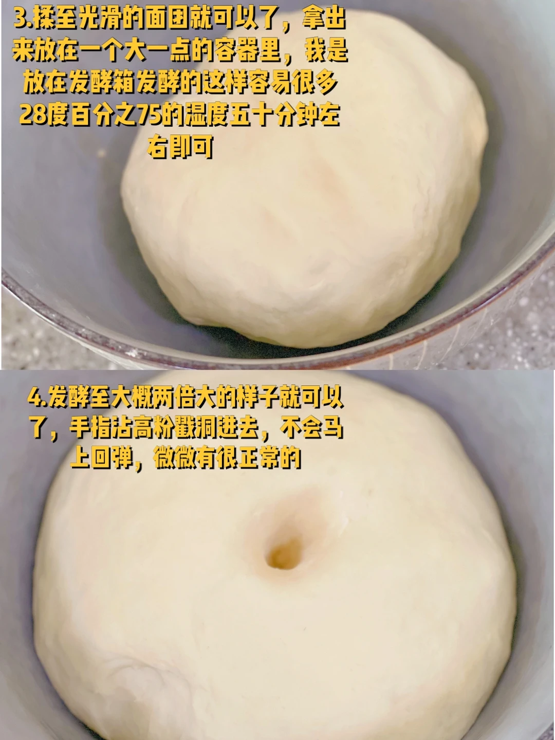4.发酵至大概两倍大的样子就可以了,手指沾高粉戳洞进去,不会马上回弹,微微有很正常的