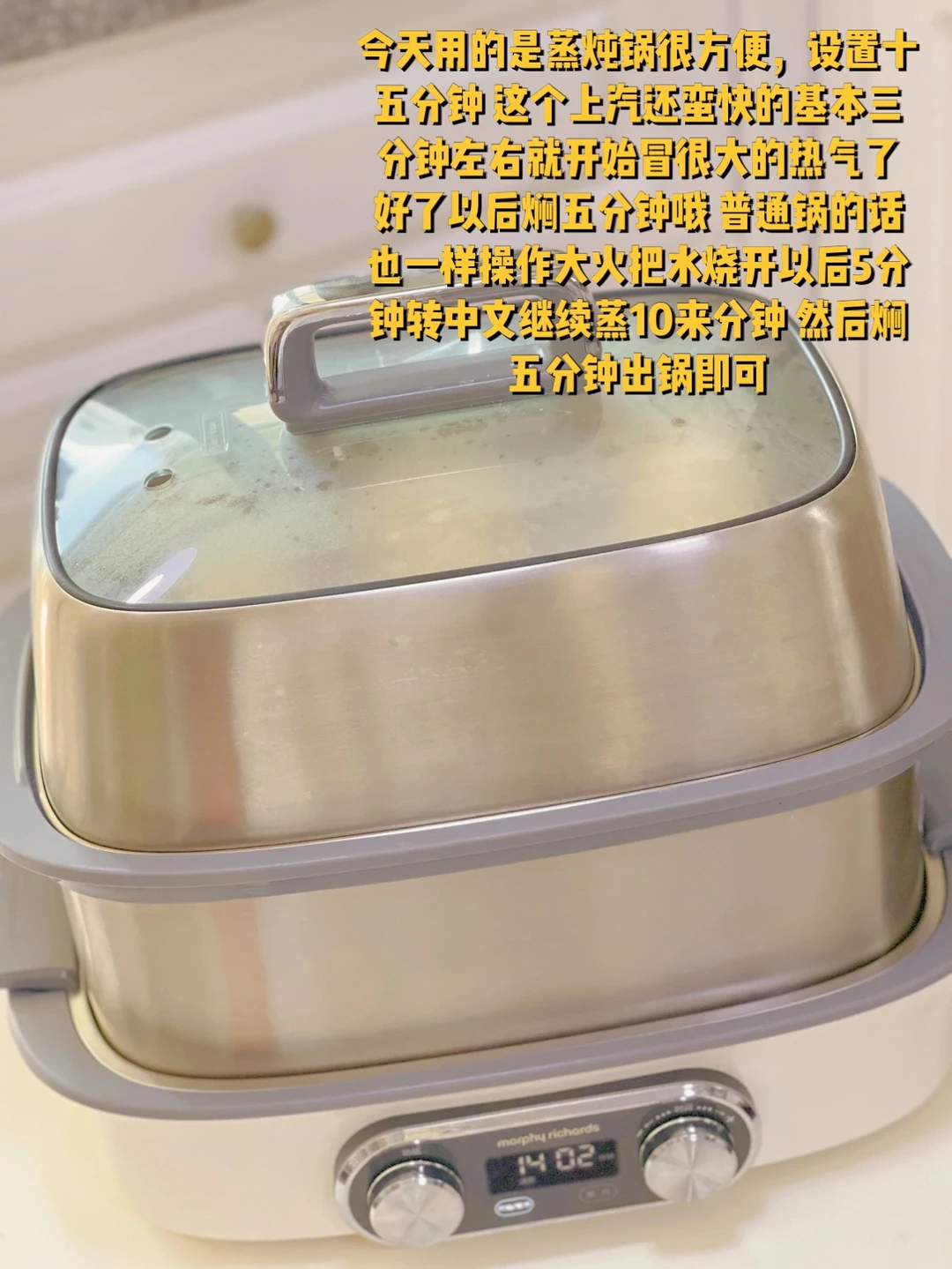13 今天用的是蒸炖锅很方便,设置十五分钟 这个上汽还蛮快的基本三分钟左右就开始冒很大的热气了 好了以后焖五分钟哦 普通锅的话也一样操作大火把水烧开以后5分钟转中文继续蒸10来分钟 然后焖五分钟出锅即可