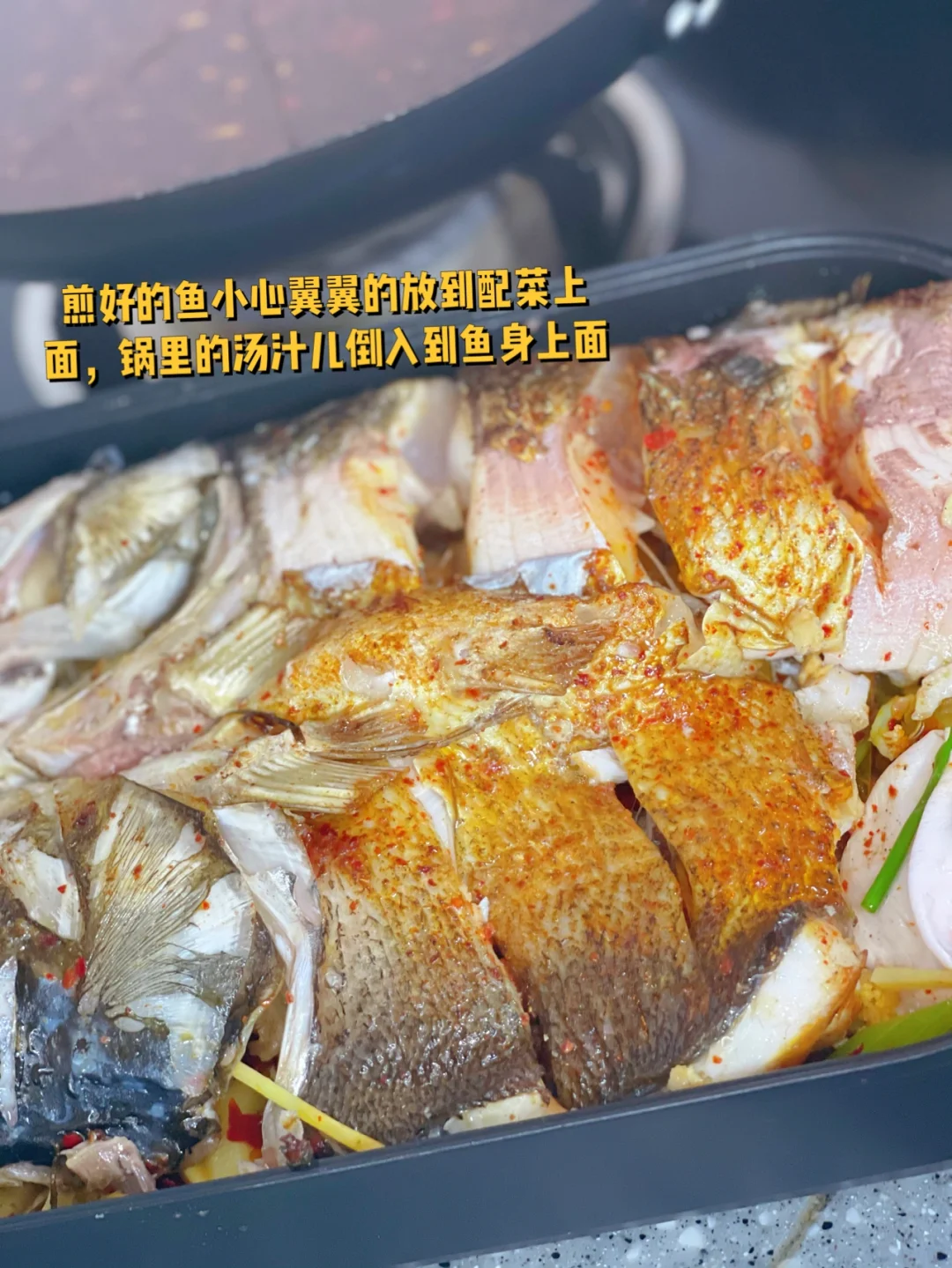 8. 煎好的鱼小心翼翼的放到配菜上面,锅里的汤汁儿倒入到鱼身上面
