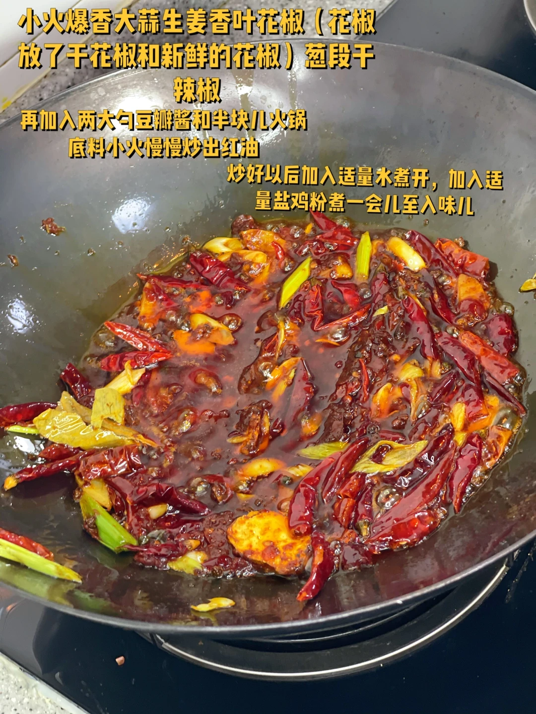 再加入两大勺豆瓣酱和半块儿火锅底料小火慢慢炒出红油