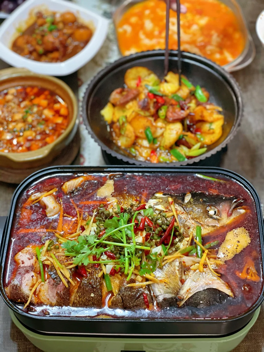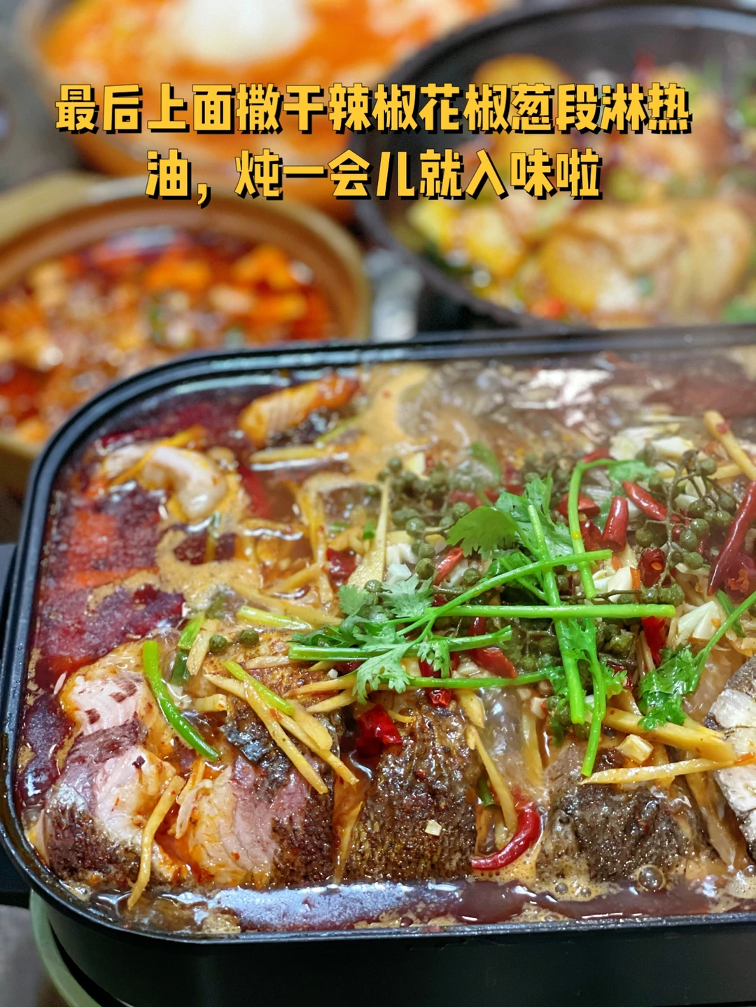 9.最后上面撒干辣椒花椒葱段淋热油,炖一会儿就入味啦
