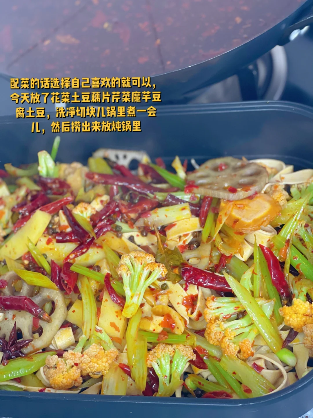 6. 配菜的话选择自己喜欢的就可以,今天放了花菜土豆藕片芹菜魔芋豆腐土豆,洗净切块儿锅里煮一会儿,然后捞出来放炖锅里