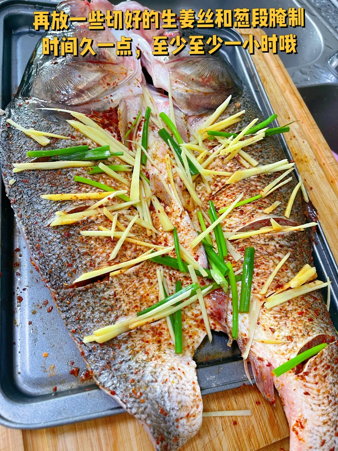 2. 再放一些切好的生姜丝和葱段腌制时间久一点,至少至少一小时哦