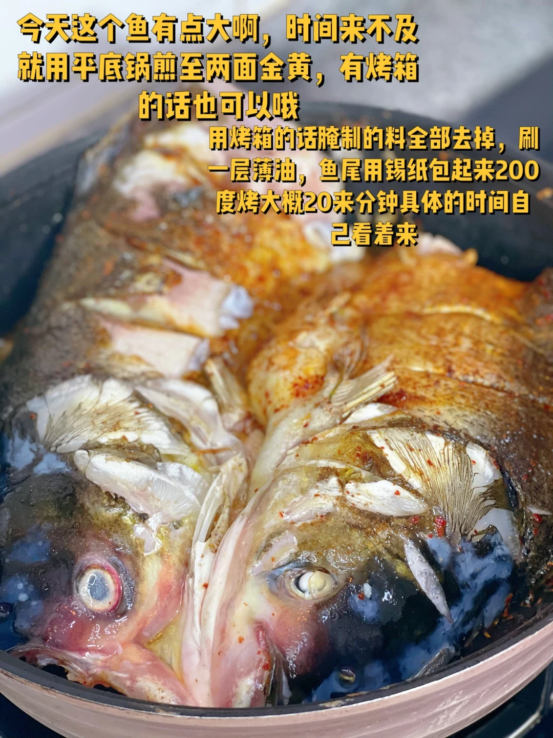 3. 今天这个鱼有点大啊,时间来不及就用平底锅煎至两面金黄,有烤箱的话也可以哦
