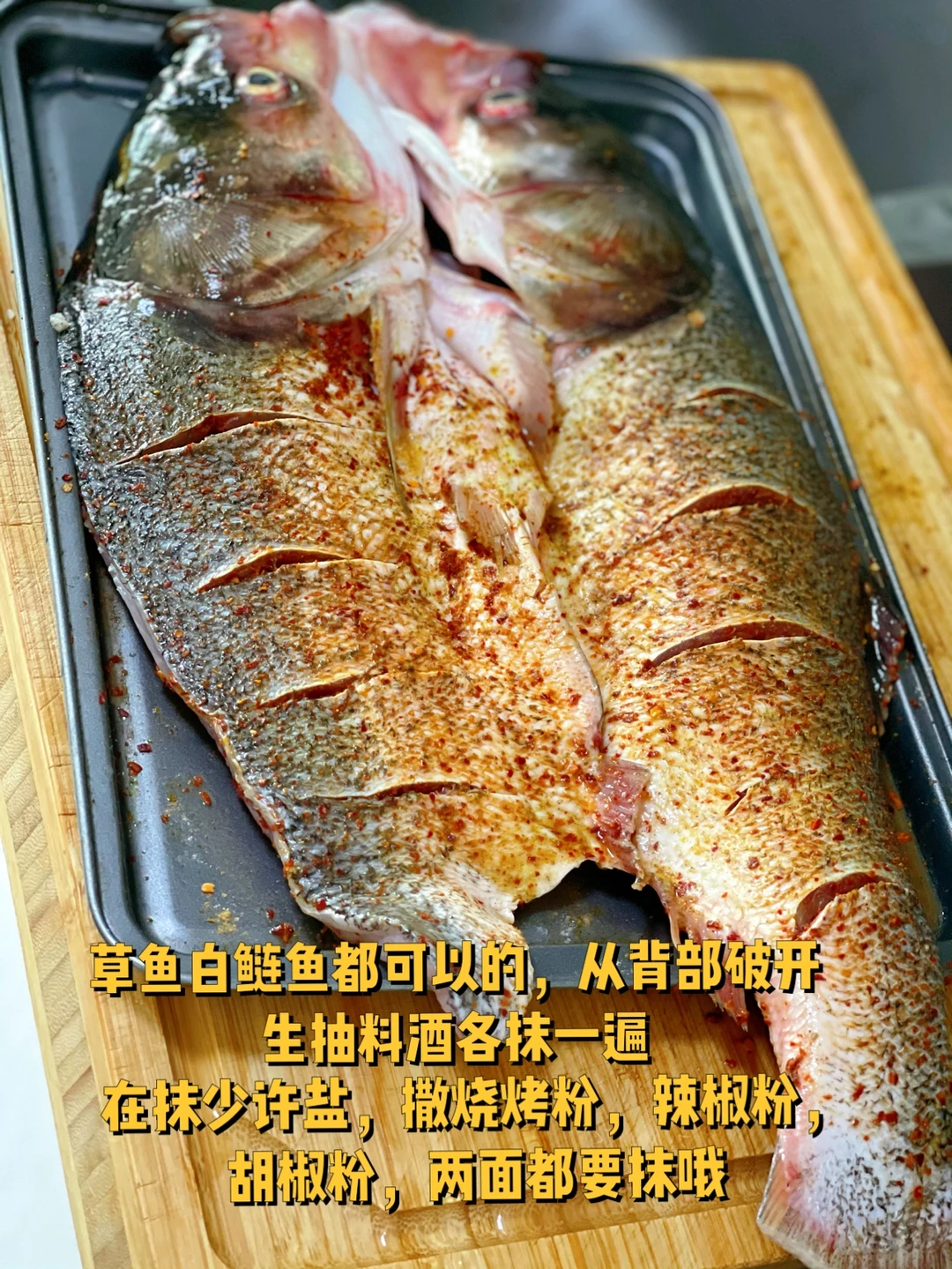 1. 草鱼白鲢鱼都可以的,从背部破开生抽料酒各抹一遍,在抹少许盐,撒烧烤粉,辣椒粉,胡椒粉,两面都要抹哦
