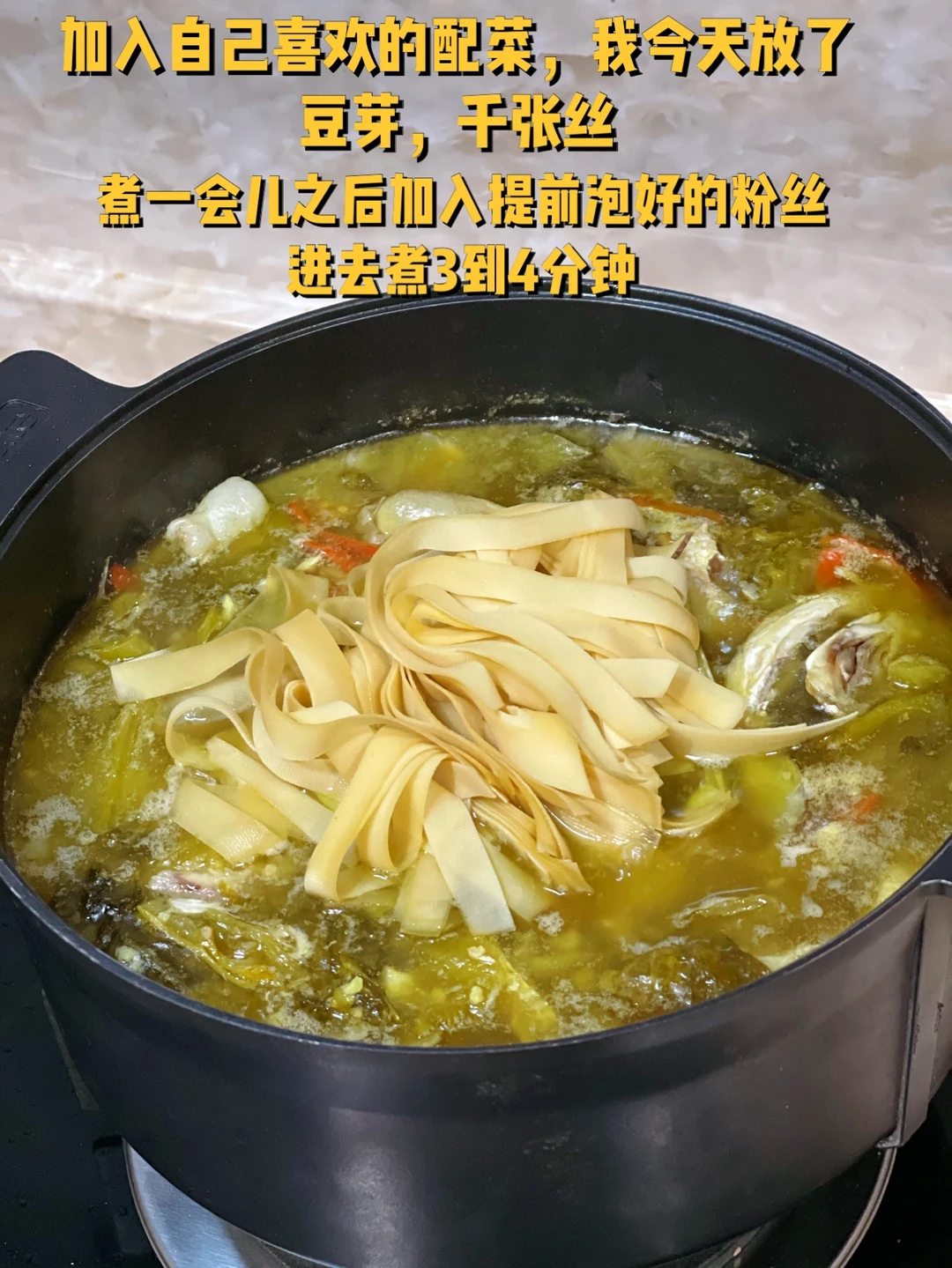 9. 加入自己喜欢的配菜,我今天放了豆芽,千张丝,煮一会儿之后加入提前泡好的粉丝进去煮3到4分钟