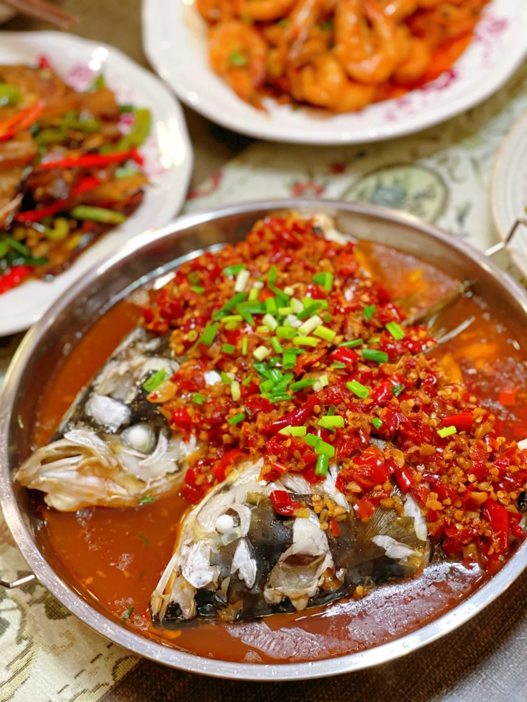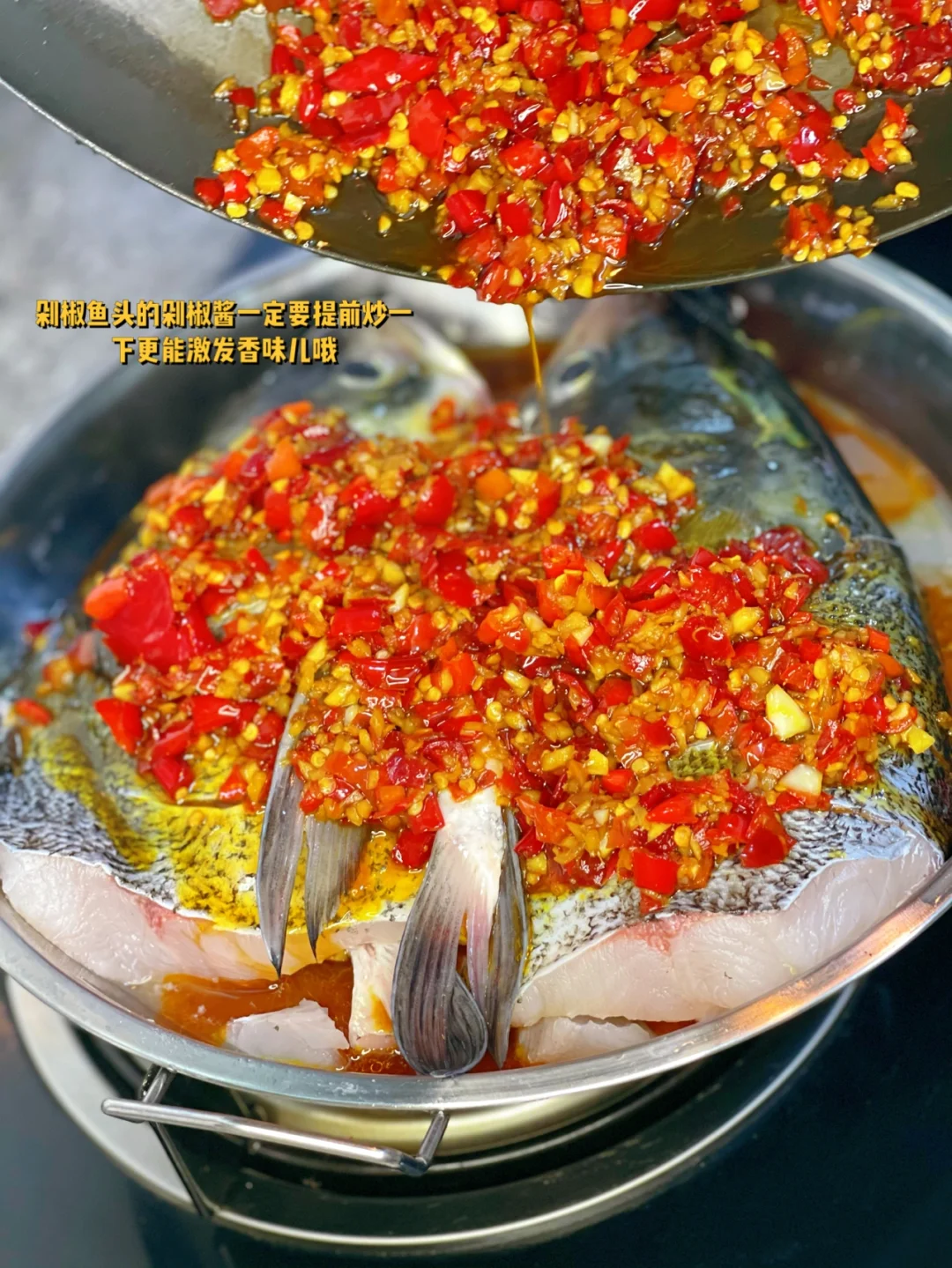 炒好的料均匀的铺在鱼头上面,水开放入锅里大会蒸20来分钟,时间不绝对大一点得鱼头时间稍微久一些