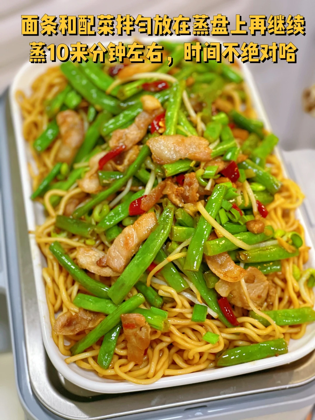 8. 面条和配菜拌匀放在蒸盘上再继续蒸10来分钟左右,时间不绝对哈
