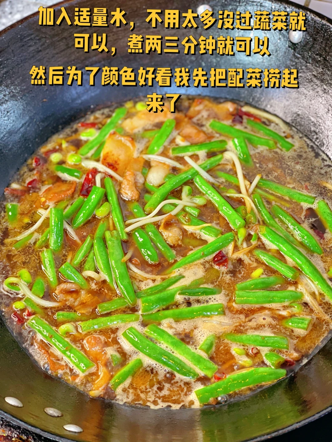 6. 加入适量水,不用太多没过蔬菜就可以,煮两三分钟就可以,然后为了颜色好看我先把配菜捞起来了