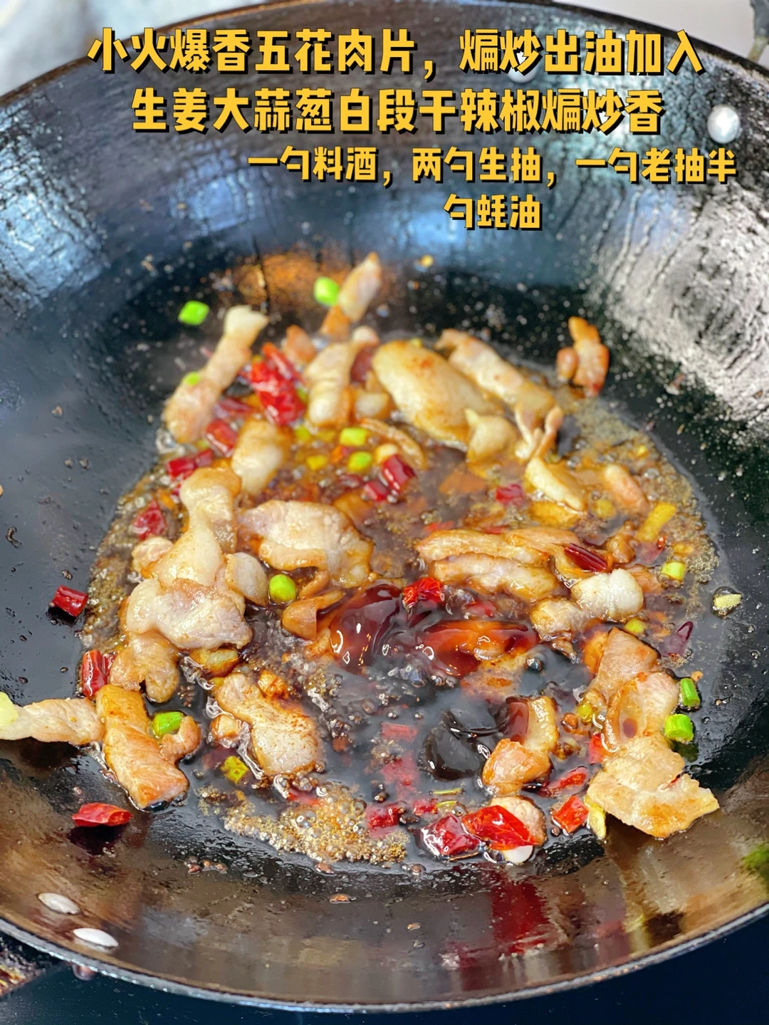 2. 小火爆香五花肉片,煸炒出油加入生姜大蒜葱白段干辣椒煸炒香,一勺料酒,两勺生抽,一勺老抽半勺蚝油