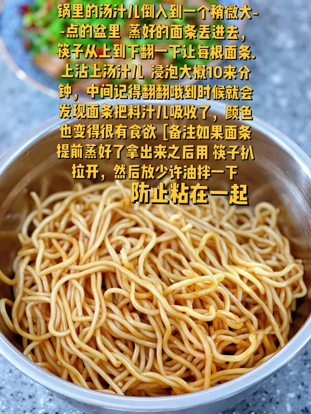 浸泡大概10来分钟,中间记得翻翻哦到时候就会发现面条把料汁儿吸收了,颜色也变得很有食欲