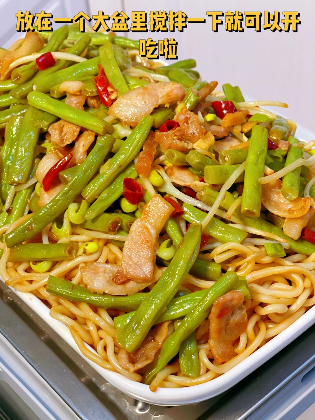 4. 准备好的豆角和豆芽丢进去快速翻炒一会儿