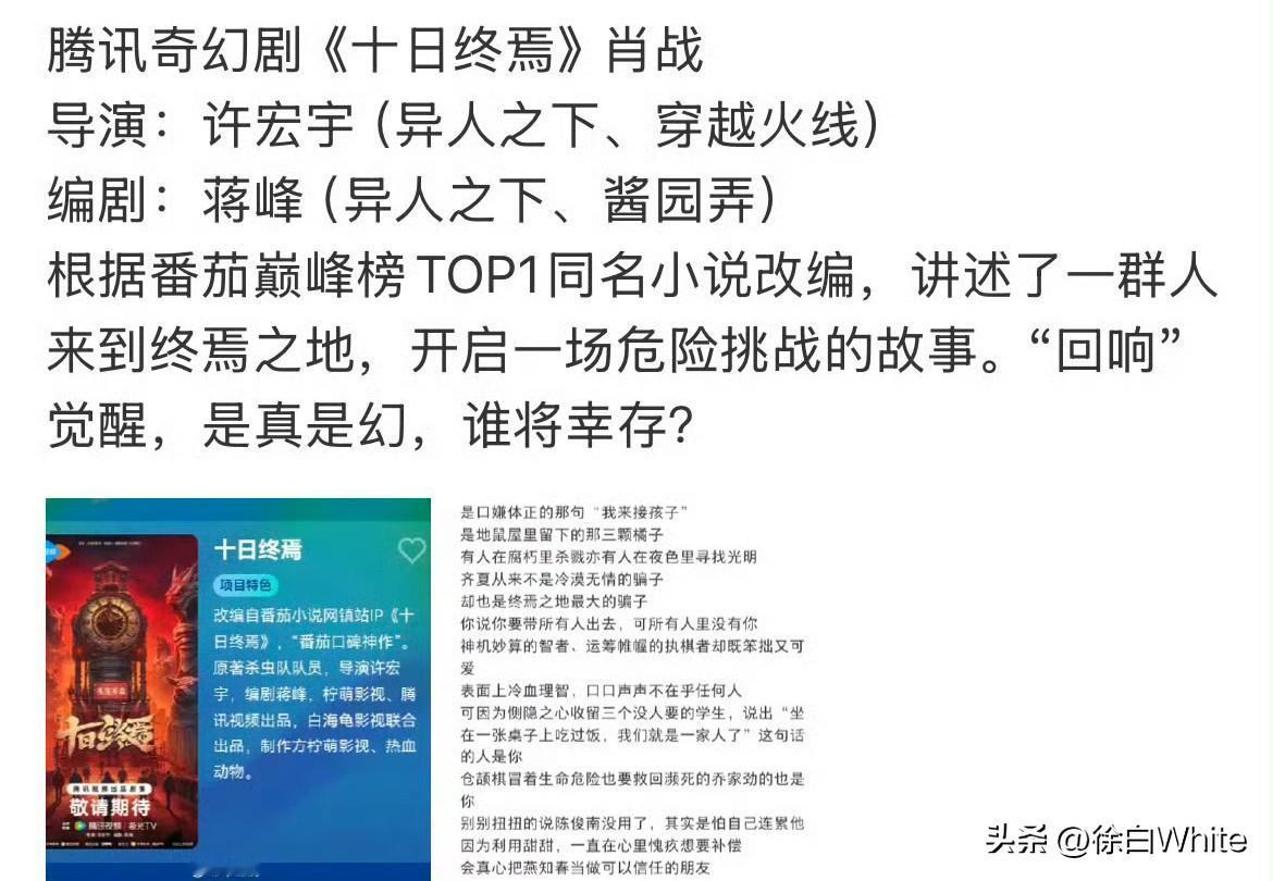 1月12日,肖战新剧《十日终焉》延期4月福州开机,原著粉力荐男主,一致认为肖战非常契合齐夏“高智疯批”“外冷内热”的特质 这部剧原著以“无限流+规则怪谈”设定、密集伏笔和人性博弈著称,影视化注定其中有部分内容会被删减,原著粉们心里都有底 当初传出要影视化时,原著粉就曾喊话肖战粉丝不要害怕,“如果一定要拍,我希望是肖战”,很多剧原著粉是不接受影改演员的,认为片方选角有问题,这次是原著粉主动提出找肖战,片方确实也参考了原著粉的意见,与肖战合作,共同打造这部剧!