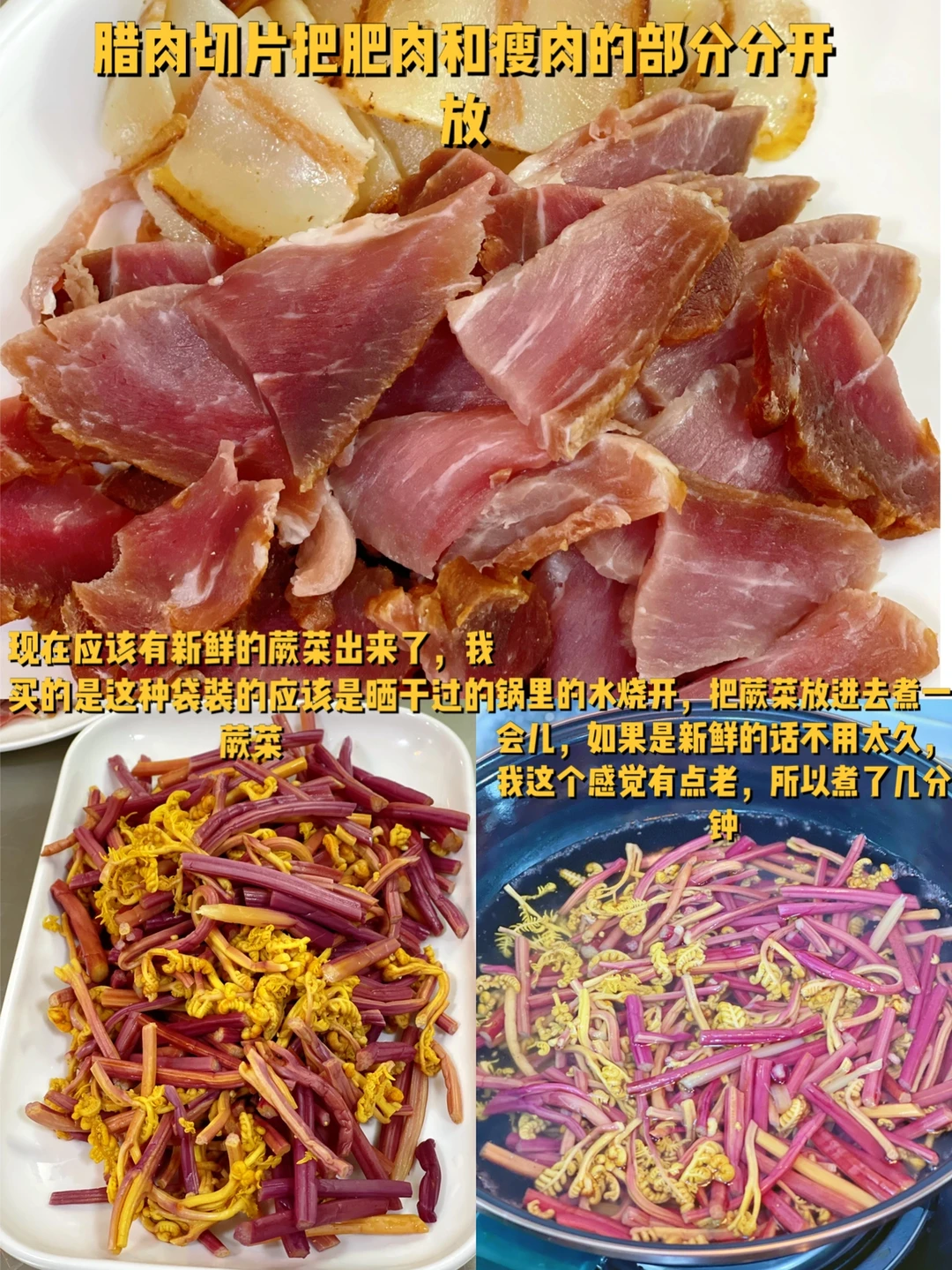 1. 腊肉切片把肥肉和瘦肉的部分分开放