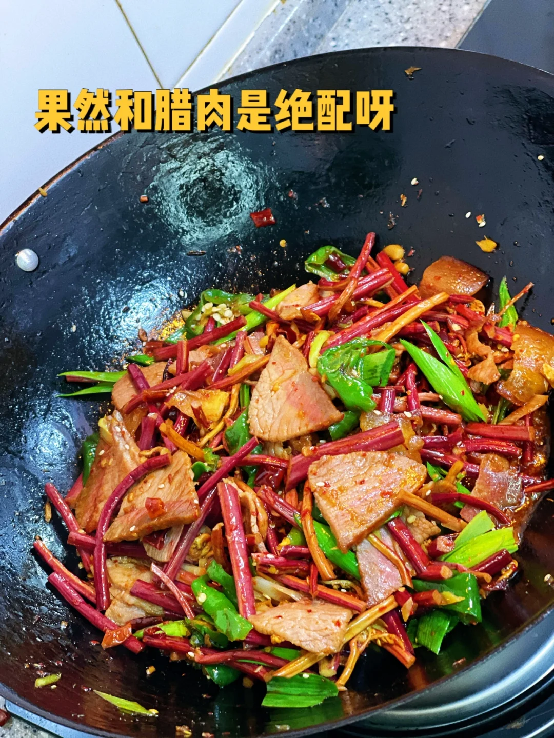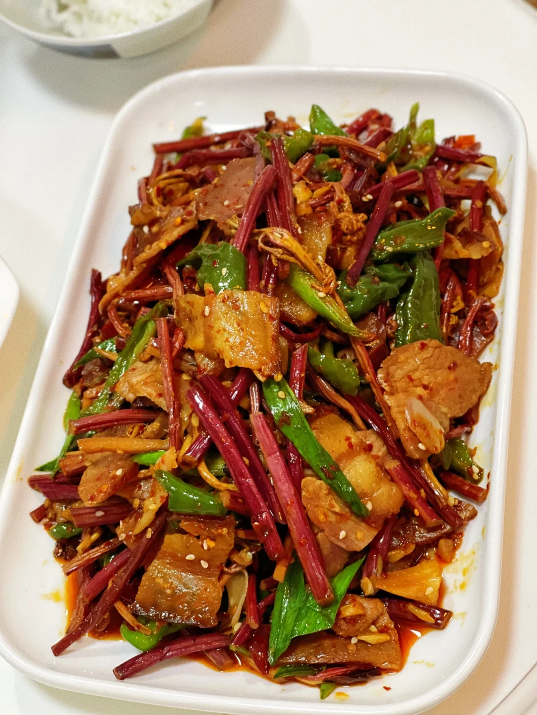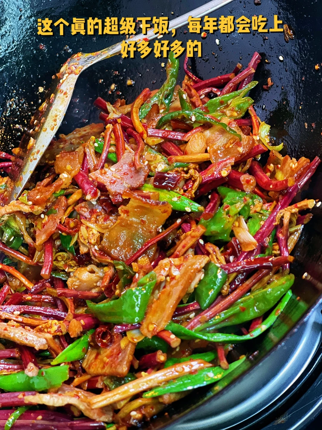 6. 出锅前加入多一些的蒜苗段或者是葱花段都可以炒匀就可以出锅啦!这个真的超级下饭,每年都会吃上好多好多的