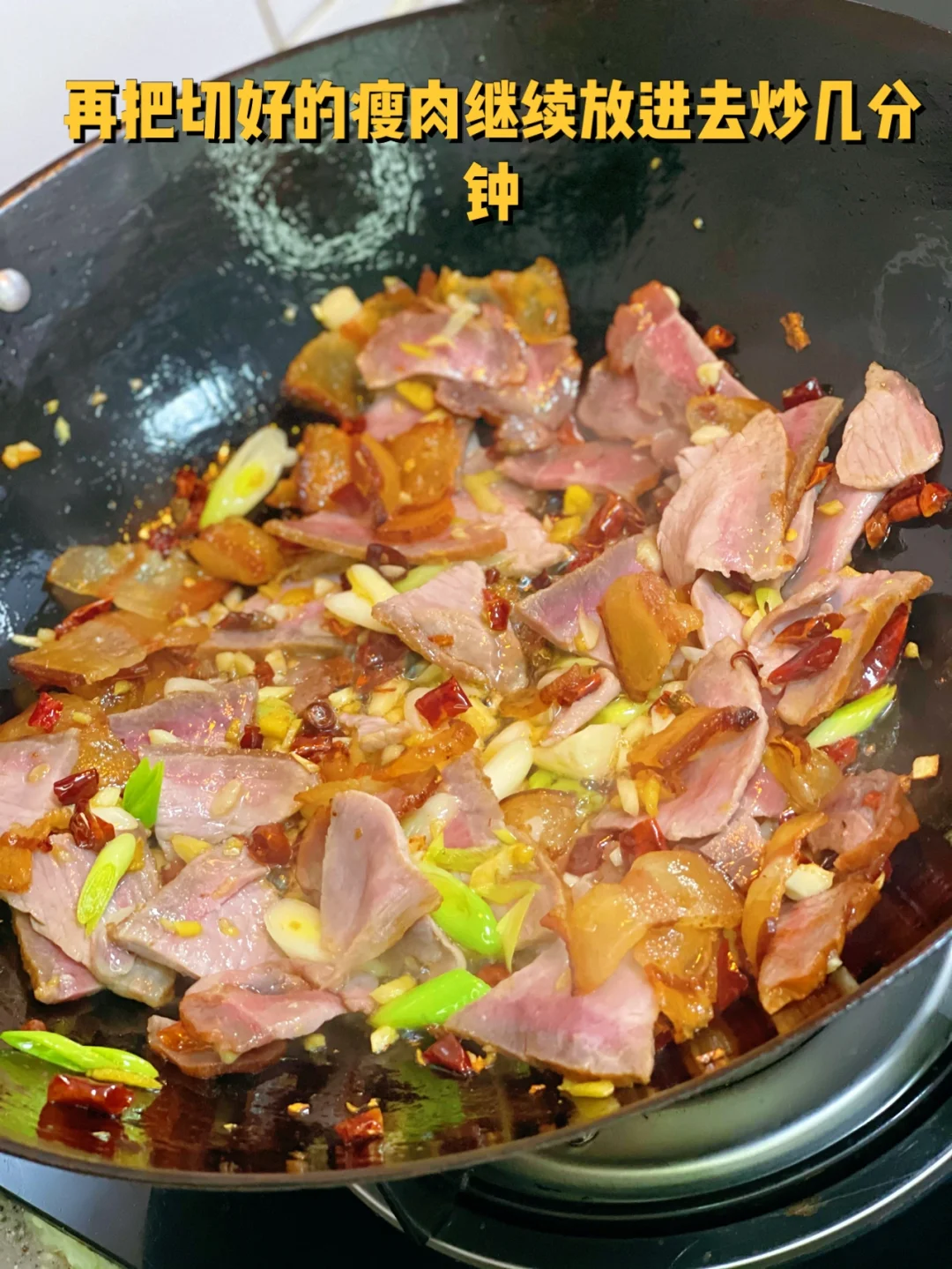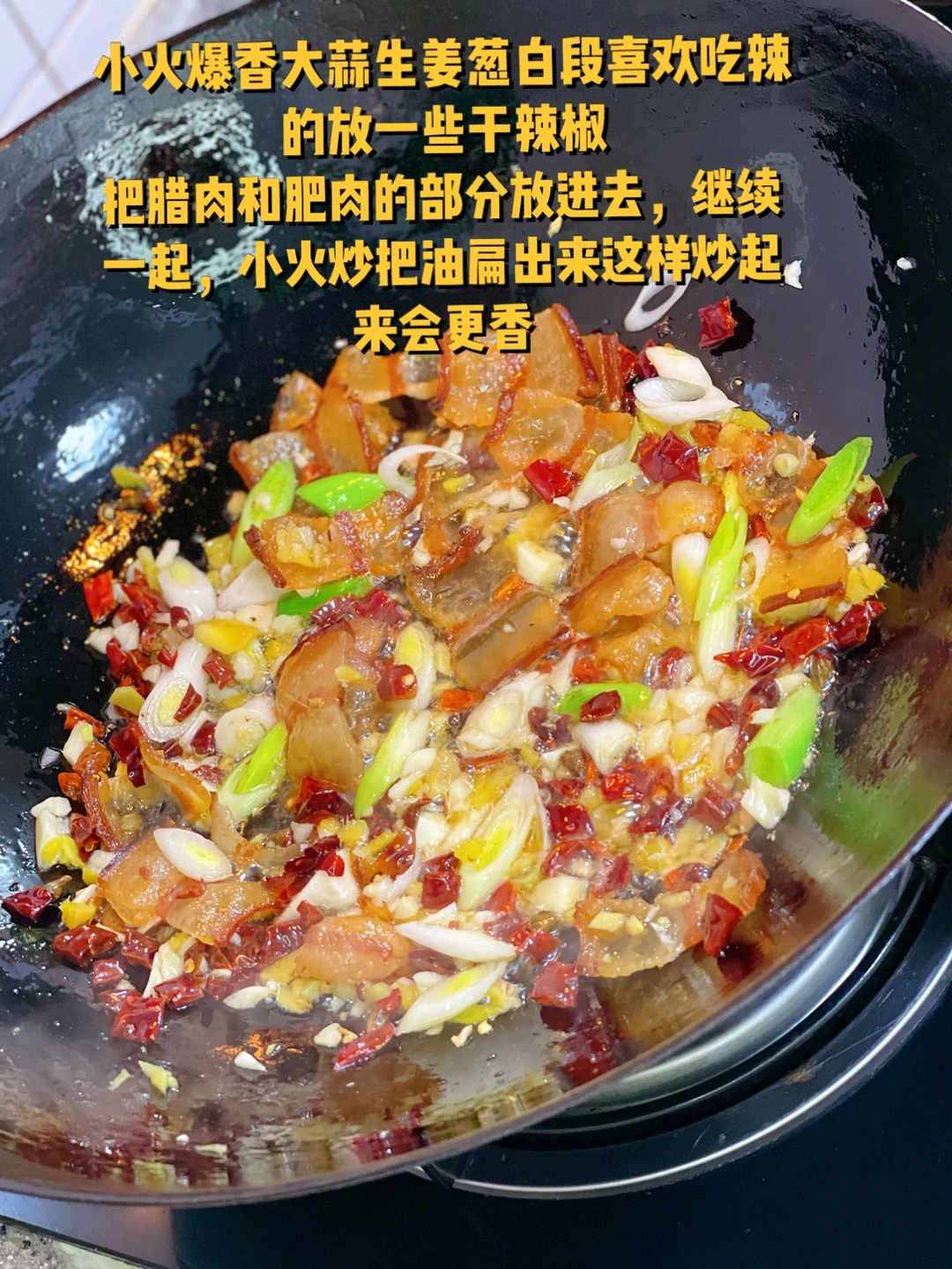 4. 小火爆香大蒜生姜葱白段喜欢吃辣的放一些干辣椒,把腊肉和肥肉的部分放进去,继续一起,小火炒把油扁出来这样炒起来会更香,再把切好的瘦肉继续放进去炒几分钟