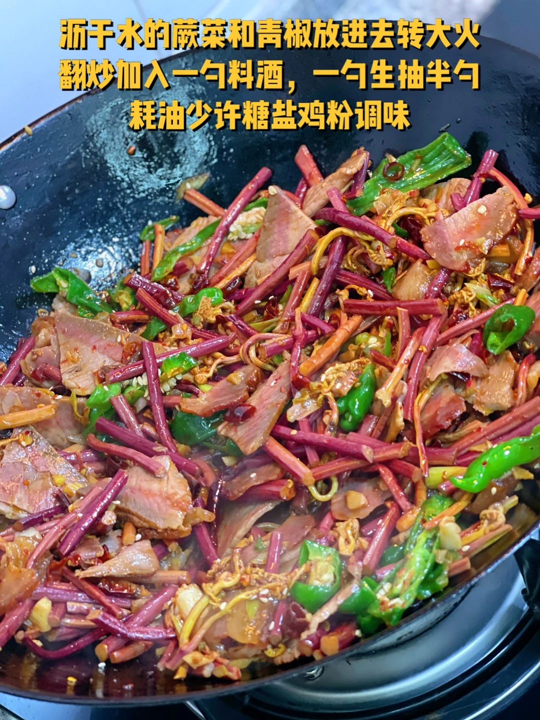 5. 沥干水的蕨菜和青椒放进去转大火翻炒加入一勺料酒一勺生抽半勺耗油少许糖盐鸡粉调味