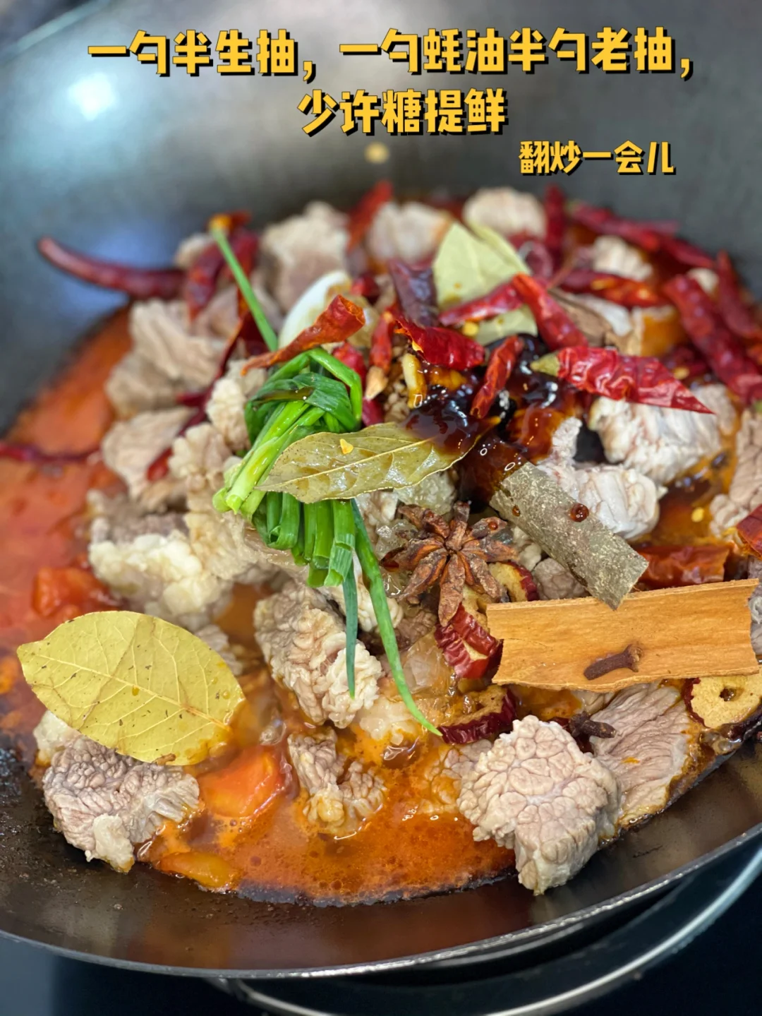 3. 牛肉块儿丢进去,然后放八角香叶桂皮丁香冰糖山楂干辣椒