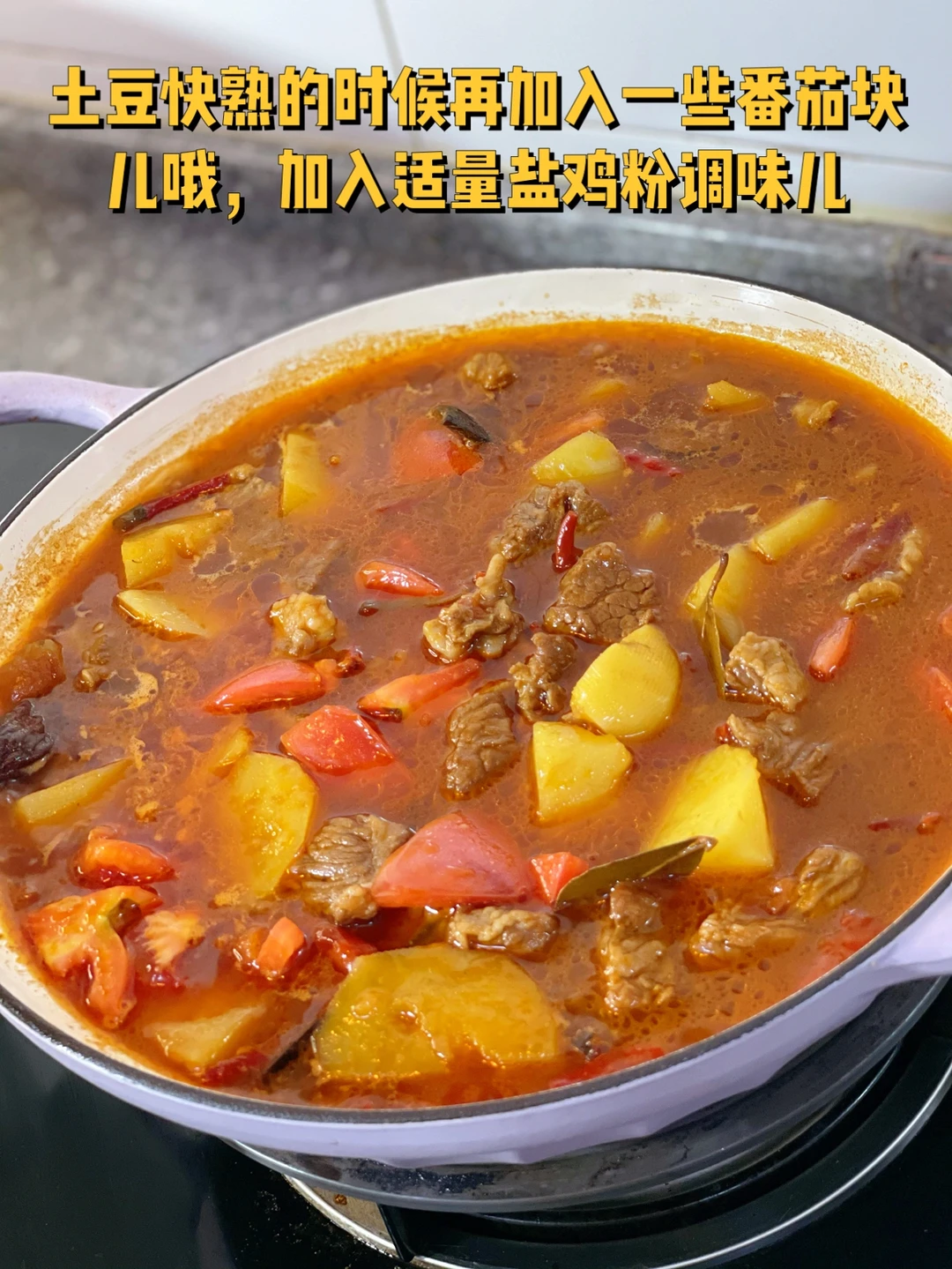 8. 土豆快熟的时候再加入一些番茄块儿哦,加入适量盐鸡粉调味
