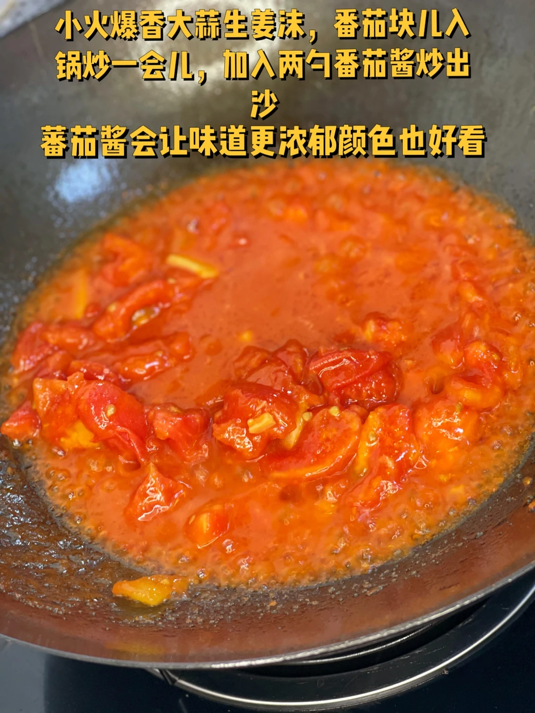 2. 小火爆香大蒜生姜沫,番茄块儿入锅炒一会儿,加入两勺番茄酱炒出沙,蕃茄酱会让味道更浓郁颜色也好看