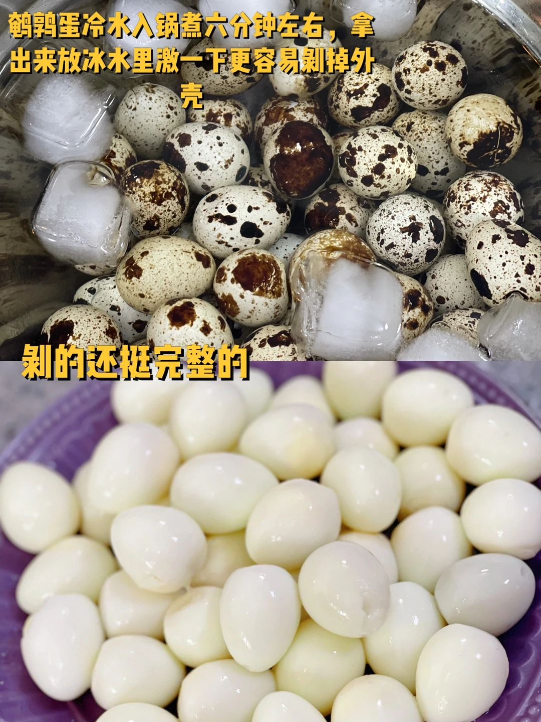 1. 鹌鹑蛋冷水入锅煮六分钟左右,拿出来放冰水里激一下更容易剥掉外壳,剥的还挺完整的