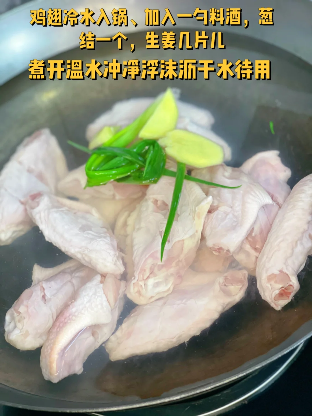 3. 鸡翅冷水入锅、加入一勺料酒,葱结一个,生姜几片儿,煮开温水冲净浮沫沥干水待用
