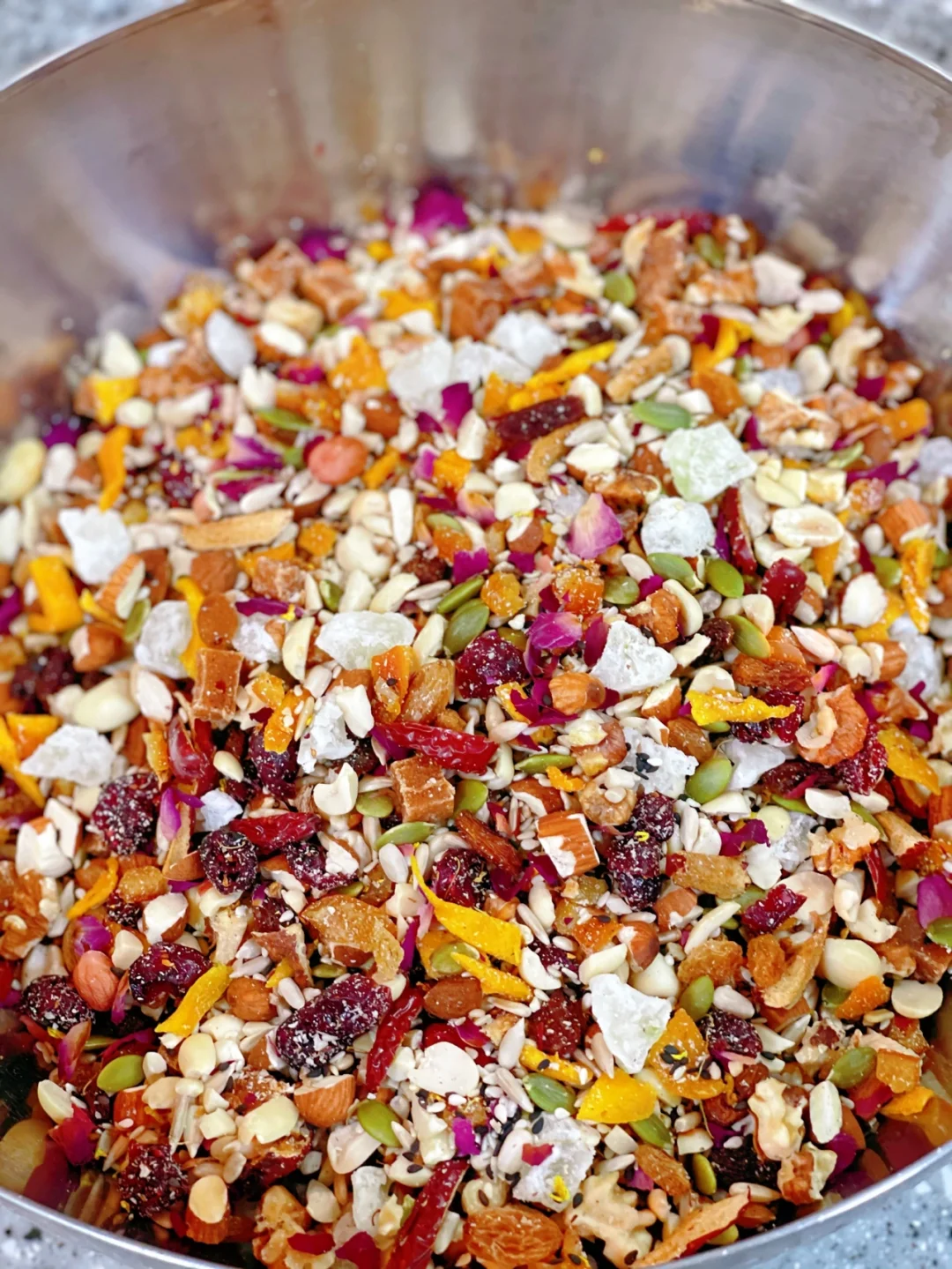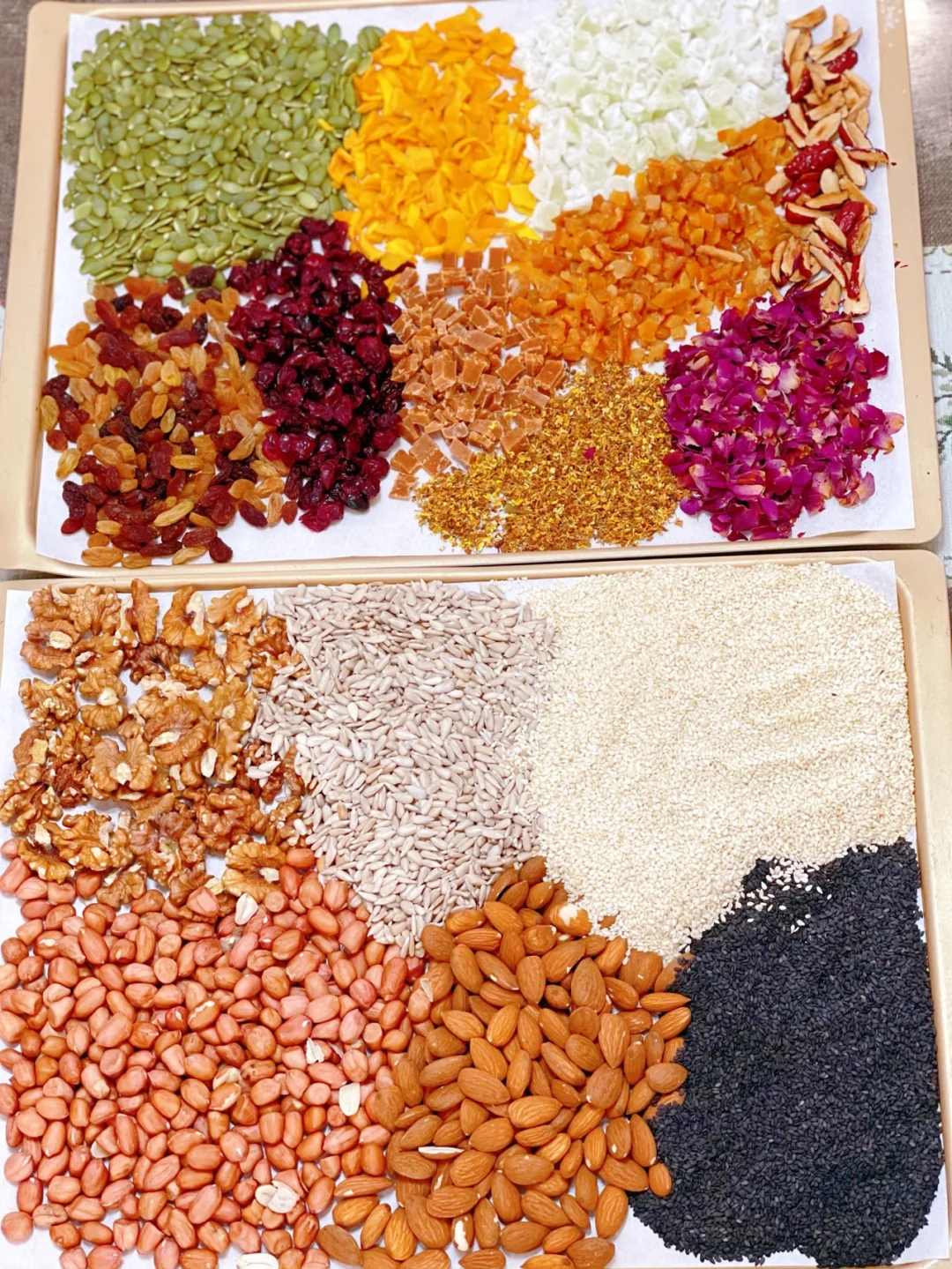 我这里有花生,核桃,榛果,南瓜籽,葵花籽,大杏仁,扁桃仁,黑芝麻、白芝麻,山楂条,冬瓜条,葡萄干,芒果干,蔓越莓【陈皮丁不喜欢的就别放很多人受不了那个味道】红枣,玫瑰花,桂花