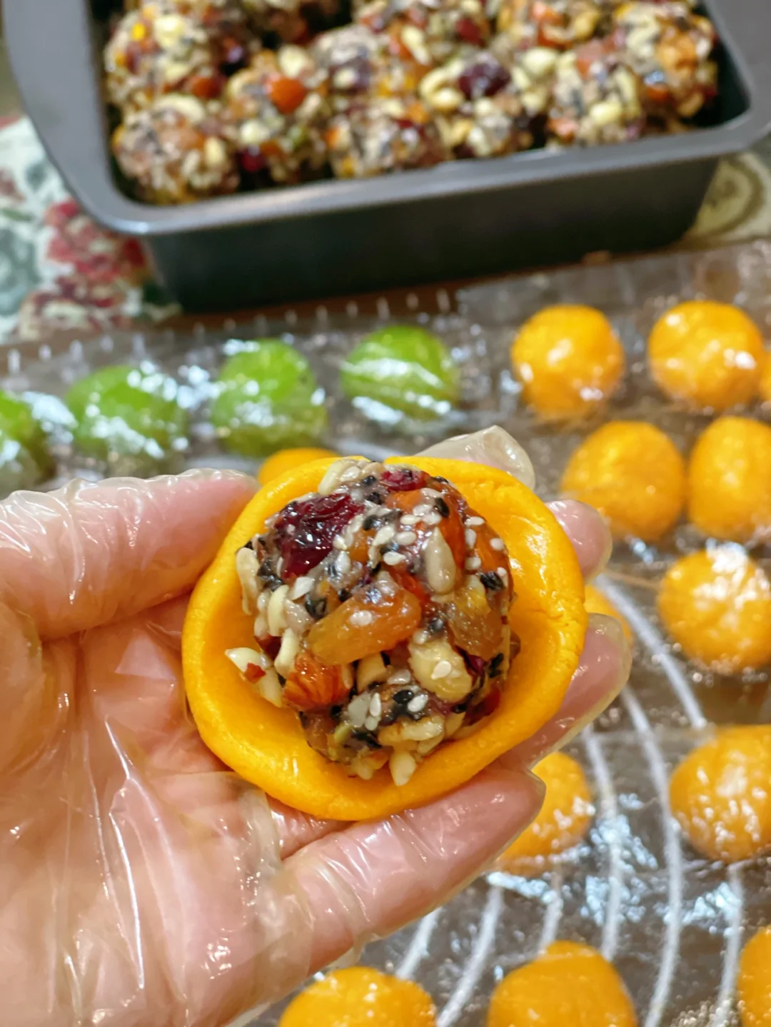 坚果和果脯弄好以后用剪刀弄成小碎,花生外衣去掉用擀面杖碾碎一些,别太碎哦
