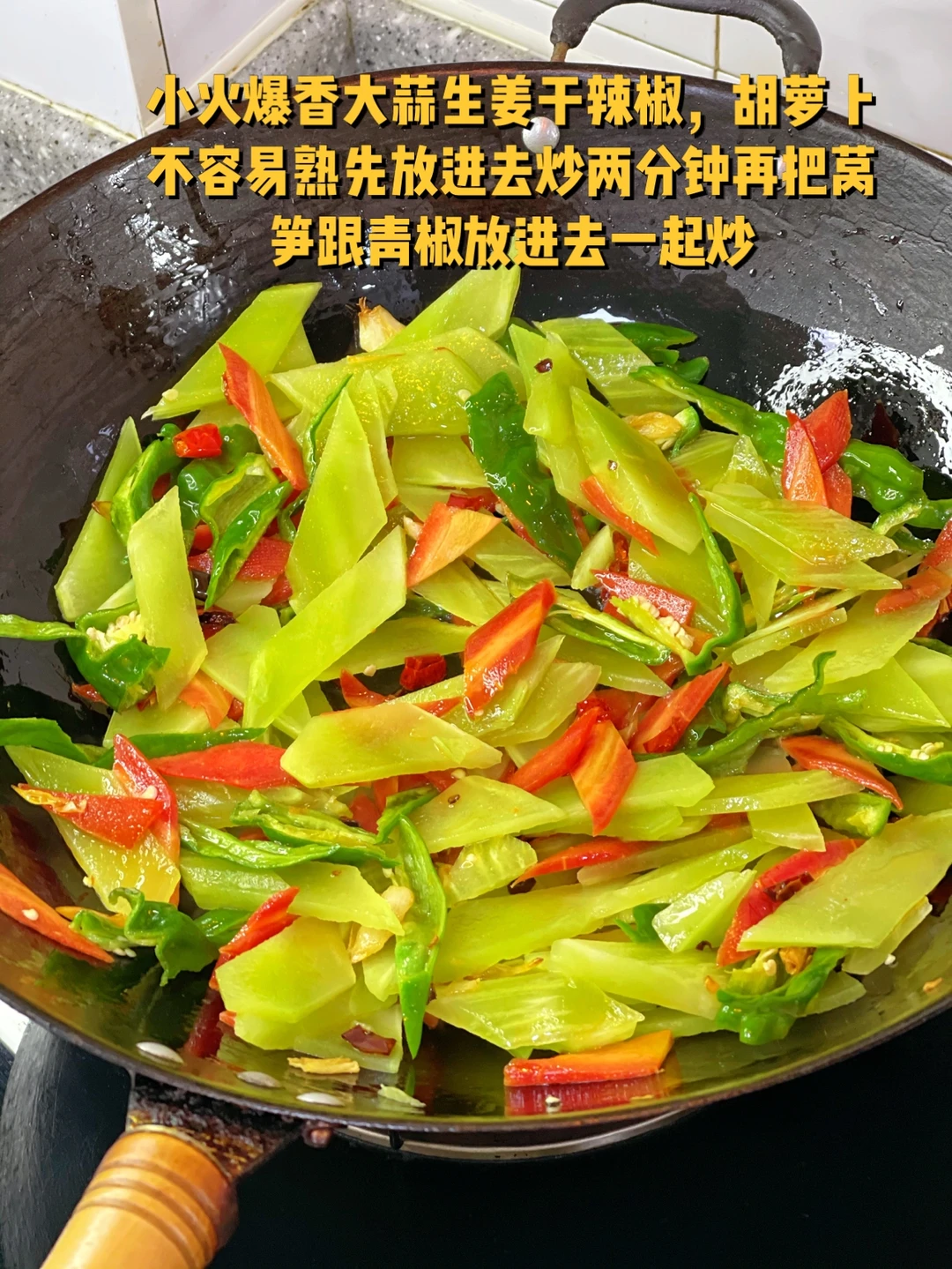 这道菜看着很普通,实际很清爽,解腻,可以放点五花肉一起炒会更香哦 1. 莴笋切片,还放了一点辣的青椒,可以不放 2. 胡萝卜🥕切片,这样不仅颜值高色彩搭配也很可,你们还可以放一点木耳也ok哦 3. 小火爆香大蒜生姜干辣椒,胡萝卜不容易熟先放进去炒两分钟再把莴笋跟青椒放进去一起炒 4. 加入一丢丢生抽少许盐鸡粉调味就可以啦