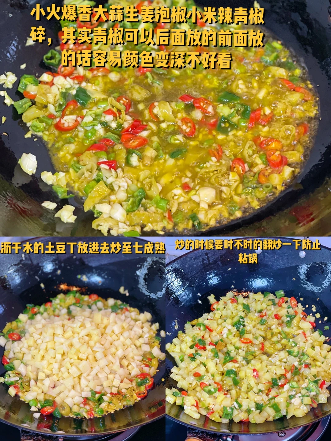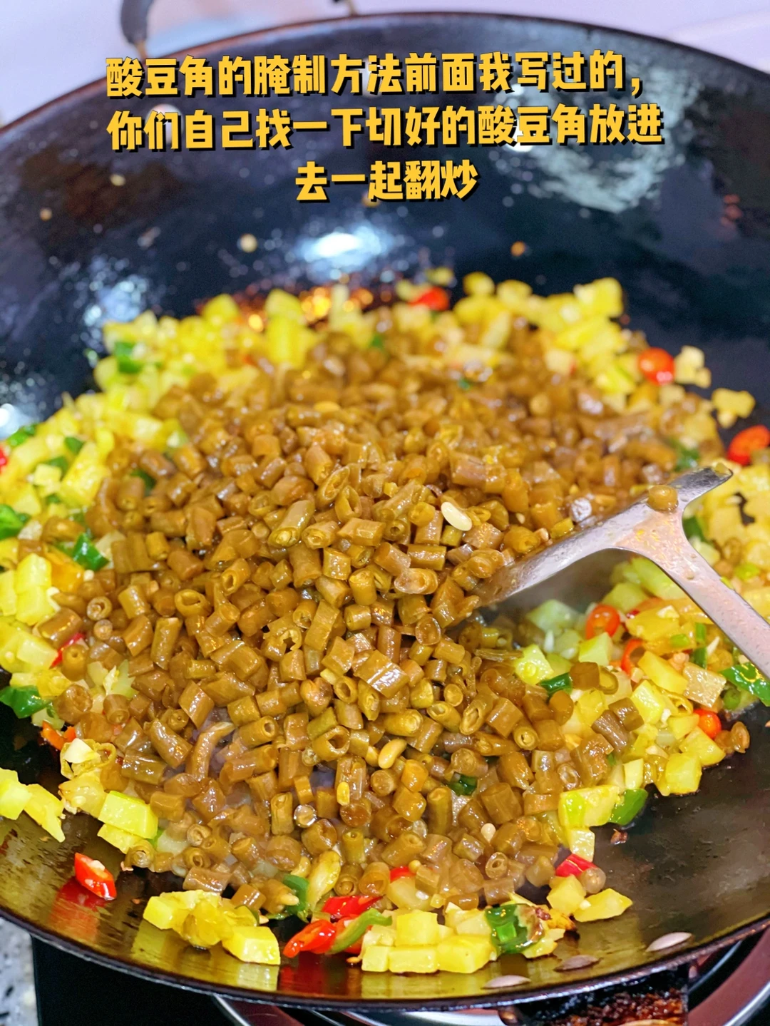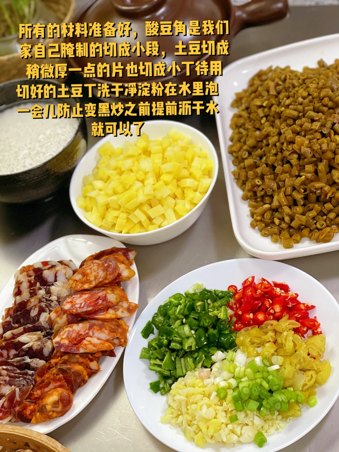 1. 所有的材料准备好,酸豆角是我们家自己腌制的切成小段,土豆切成稍微厚一点的片也切成小丁待用 切好的土豆丁洗干净淀粉在水里泡一会儿防止变黑炒之前提前沥干水就可以了 2. 小火爆香大蒜生姜泡椒小米辣青椒碎,其实青椒可以后面放的前面放的话容易颜色变深不好看 3. 炒的时候要时不时的翻炒一下防止粘锅 4. 酸豆角的腌制方法前面我写过的,你们自己找一下切好的酸豆角放进去一起翻炒 5. 加入一勺生抽少许糖盐鸡粉调味 6. 这道菜看似很简单很好吃,却也很下饭也不单调,你们还可以自己放一些肉末进去
