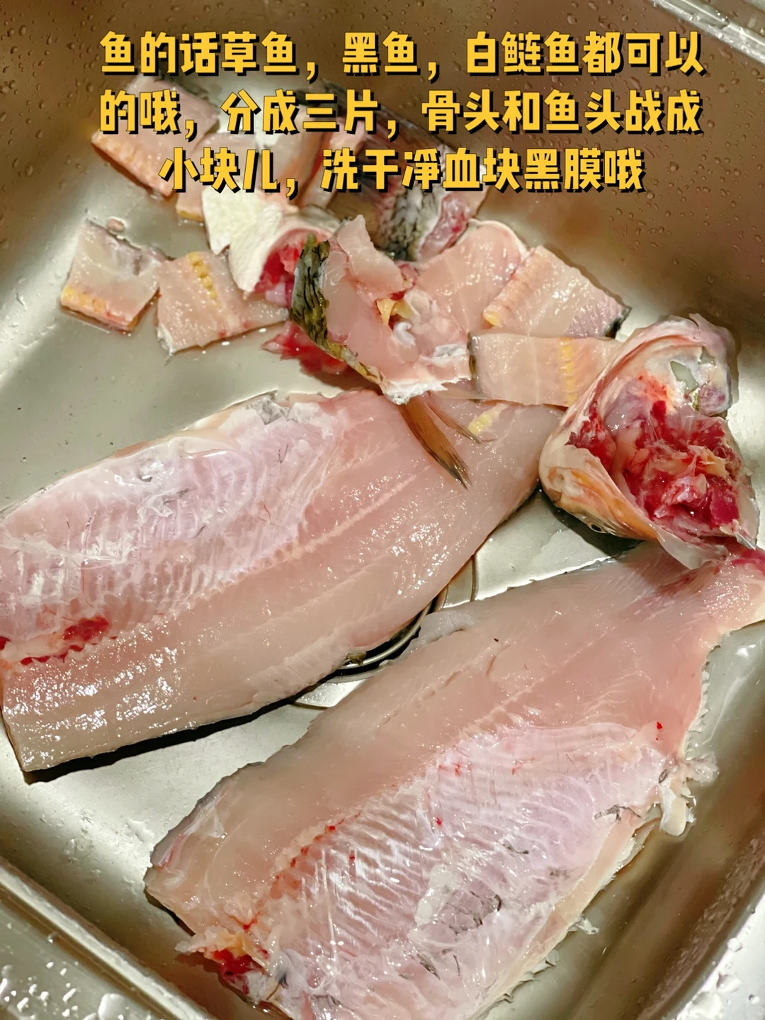1. 鱼的话草鱼,黑鱼,白鲢鱼都可以的哦,分成三片,骨头和鱼头战成小块儿,洗干净血块黑膜哦