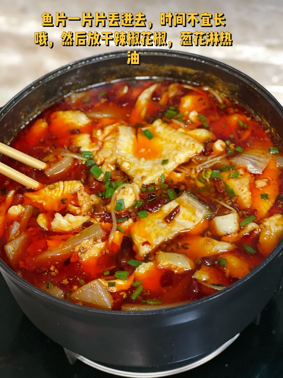 11. 鱼片一片片丢进去,时间不宜长哦,然后放干辣椒花椒,葱花淋热油就成啦