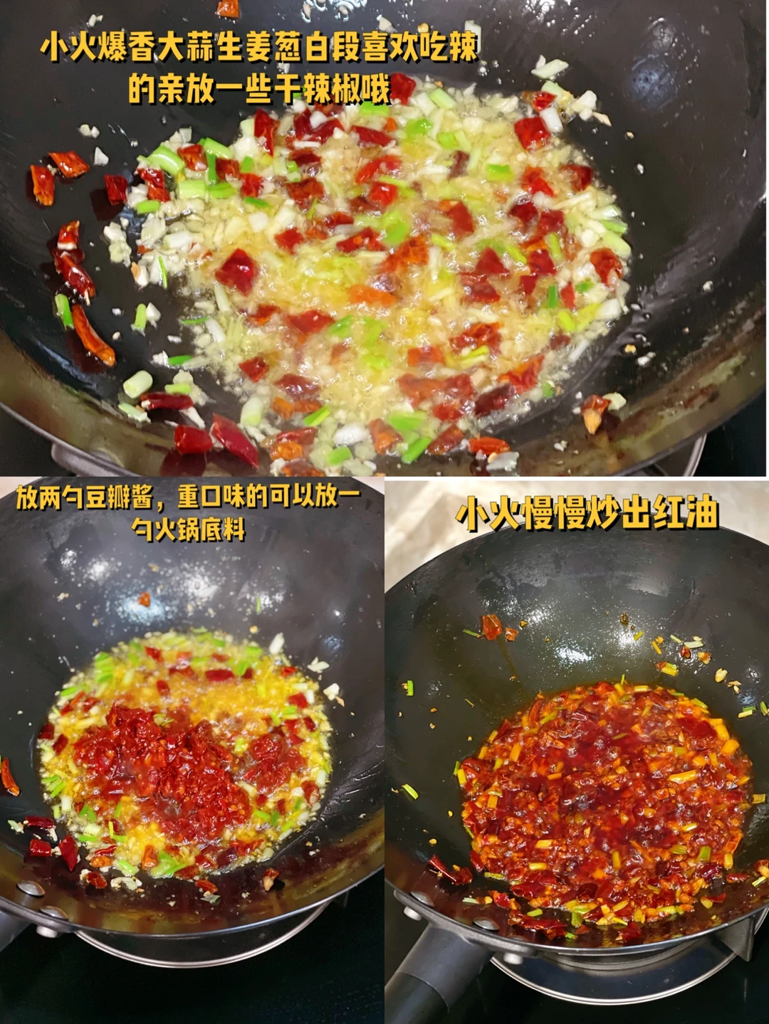5. 小火爆香大蒜生姜葱白段喜欢吃辣的亲放一些干辣椒哦