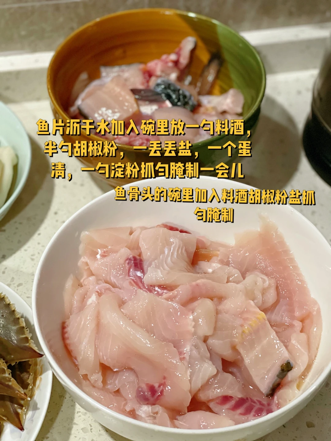 3. 鱼片沥干水加入碗里放一勺料酒,半勺胡椒粉,一丢丢盐,一个蛋清,一勺淀粉抓匀腌制一会儿,鱼骨头的碗里加入料酒胡椒粉盐抓匀腌制