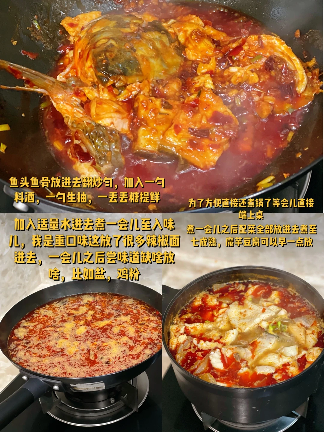 8. 鱼头鱼骨放进去翻炒匀,加入一勺料酒,一勺生抽,一丢丢糖提鲜